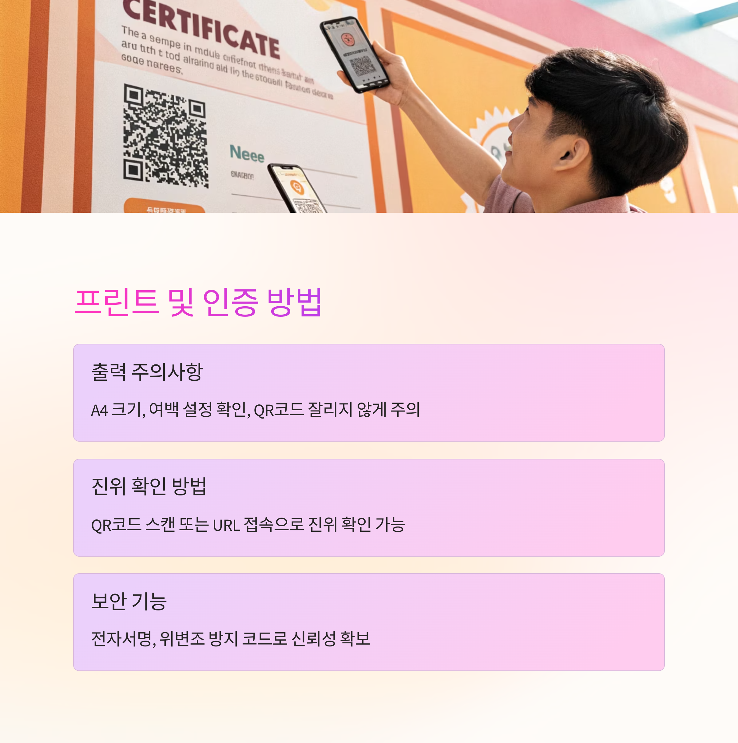 졸업증명서 하단에는 전자서명 또는 QR코드가 삽입되어 있어요. 이 부분이 잘려서 출력되면 증명서로서 인정받지 못할 수도 있으니 주의가 필요해요. 이 코드를 스캔하면 진위 여부를 바로 확인할 수 있는 페이지로 연결되기 때문에 보안 측면에서도 꼭 필요한 요소예요.