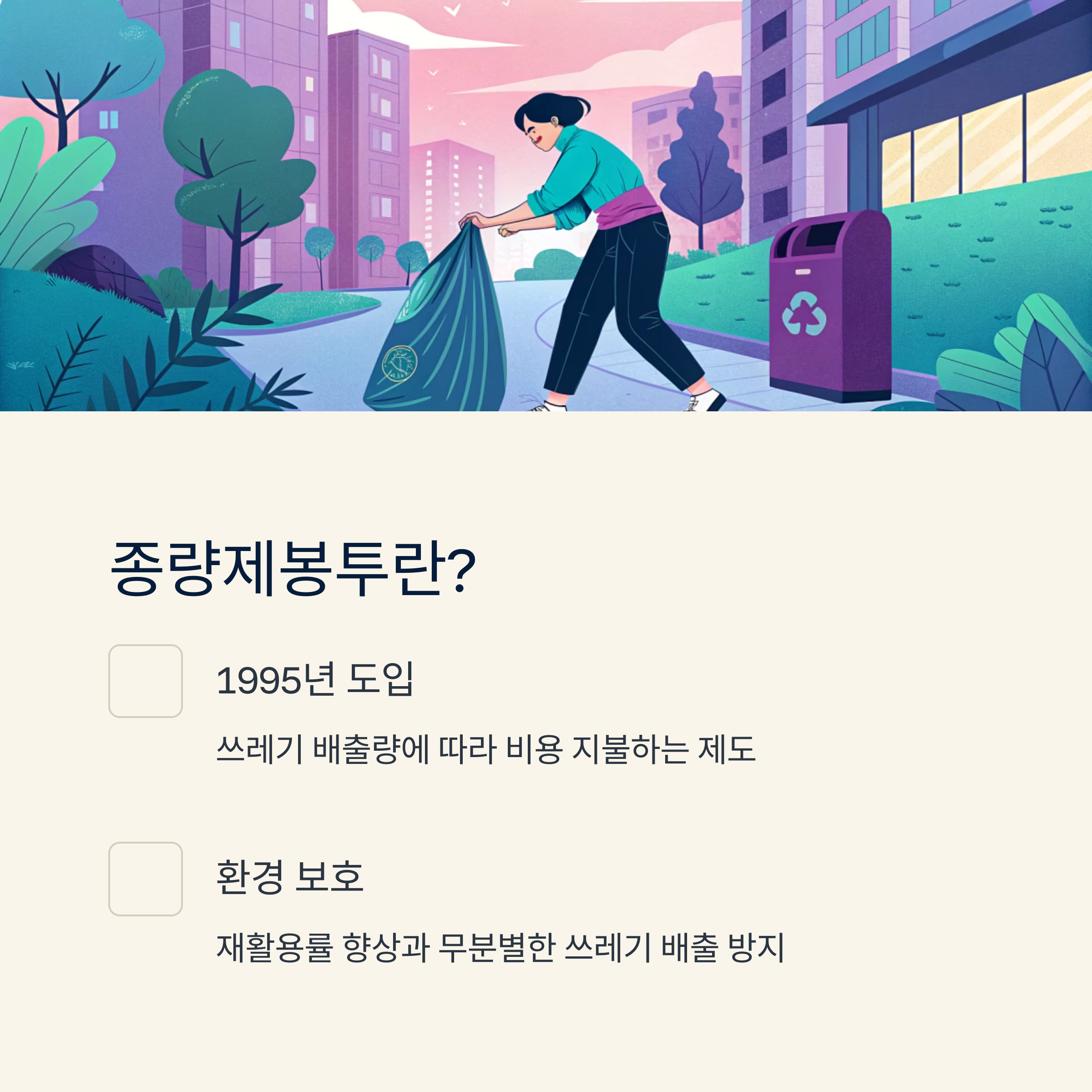 이러한 배경 속에서 정부는 환경 보호와 재활용률 향상을 목표로, 쓰레기를 무게나 부피에 따라 비용을 부담하게 하는 '종량제' 방식을 도입했어요. 이에 따라, 각 지자체는 자체 디자인과 크기로 종량제봉투를 제작해 판매하고 있어요.