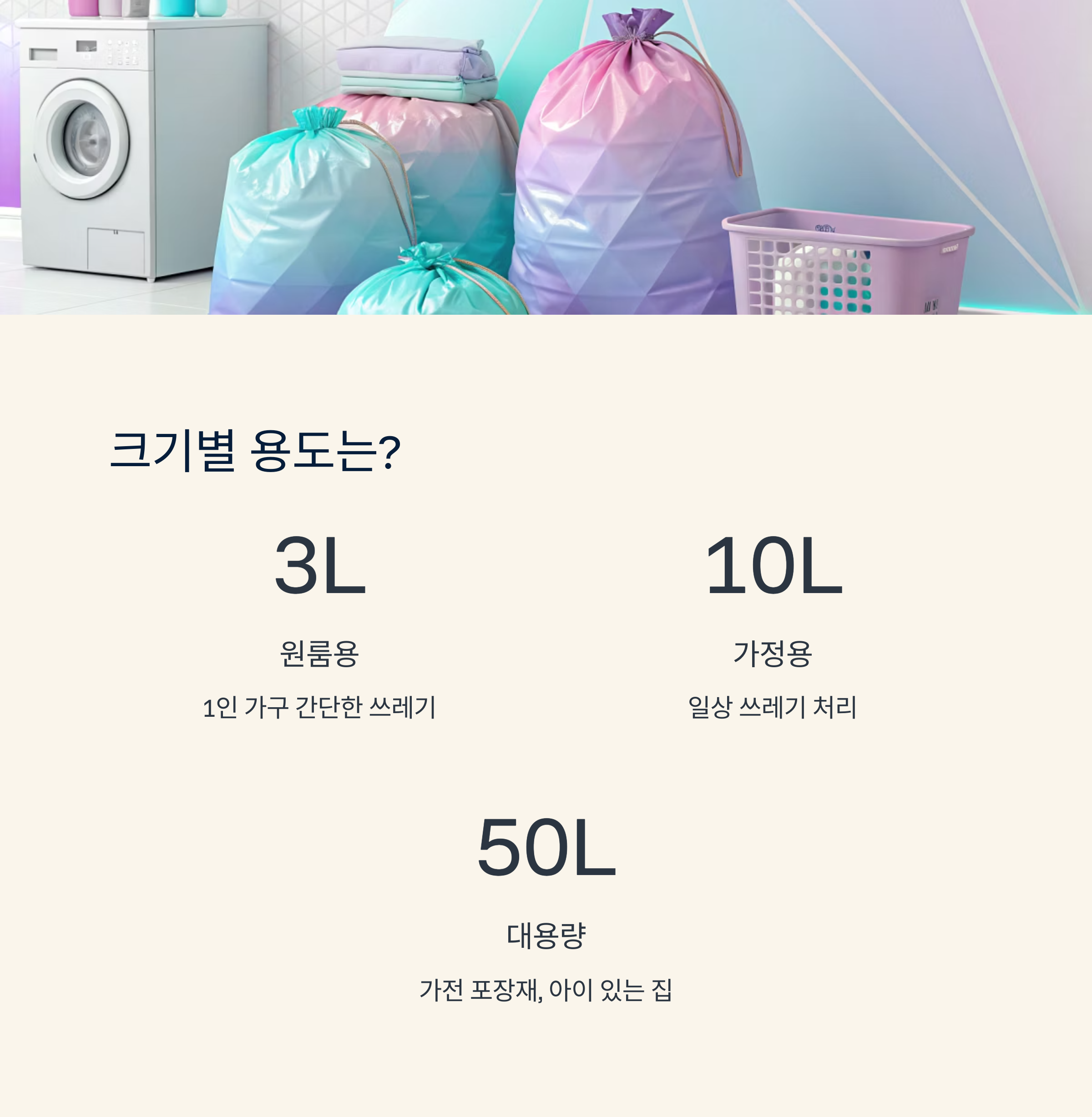 특히 아이 키우는 가정이라면 기저귀처럼 부피는 크지만 무게가 가벼운 쓰레기가 많아서 50L 봉투를 사용하기도 하죠. 반면 원룸이나 자취방이라면 5L도 충분할 수 있어요. 🏠