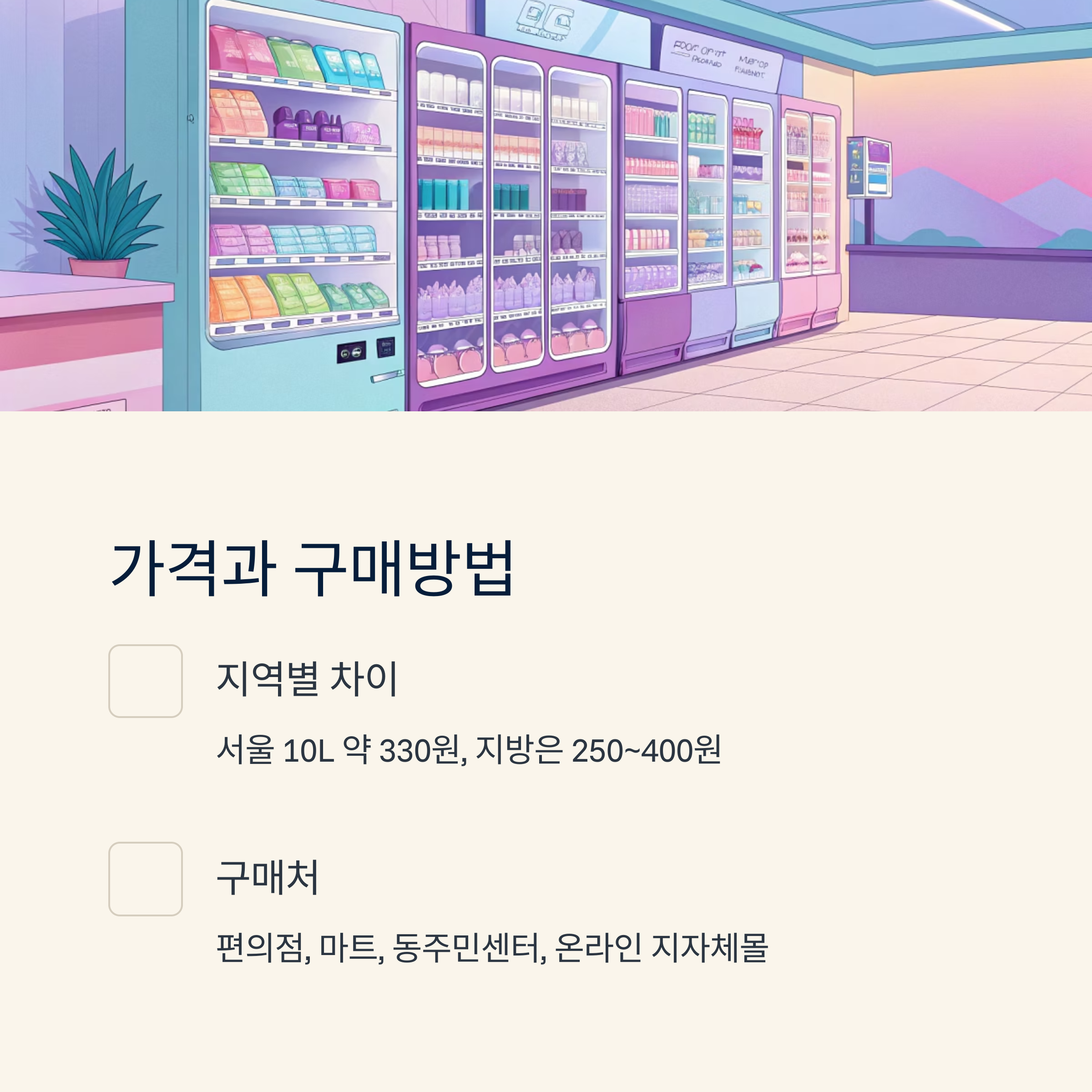 일반적으로 편의점, 마트, 슈퍼에서 손쉽게 구매할 수 있고, 동주민센터나 온라인 지자체 쇼핑몰에서도 판매하고 있어요. 단, 온라인 구매는 묶음 단위로 판매하는 경우가 많아서 소량이 필요할 때는 오히려 불편할 수 있답니다.