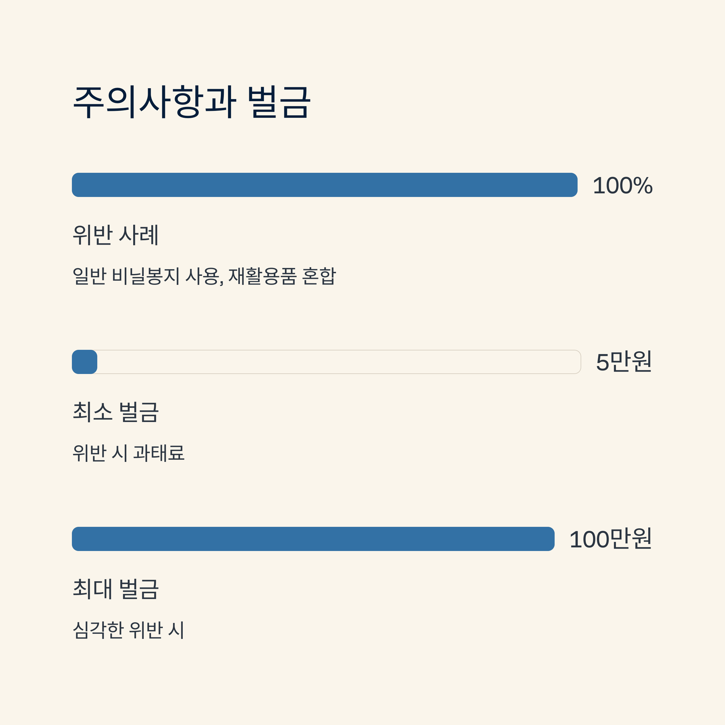 종량제봉투를 잘못 사용하면 벌금을 물 수 있어요. 예를 들어, 일반 쓰레기와 재활용 쓰레기를 혼합해서 버리거나, 종량제봉투가 아닌 일반 비닐봉지에 담아 내놓는 경우가 대표적이에요. 이렇게 되면 적게는 5만 원에서 많게는 100만 원까지 과태료가 부과돼요.