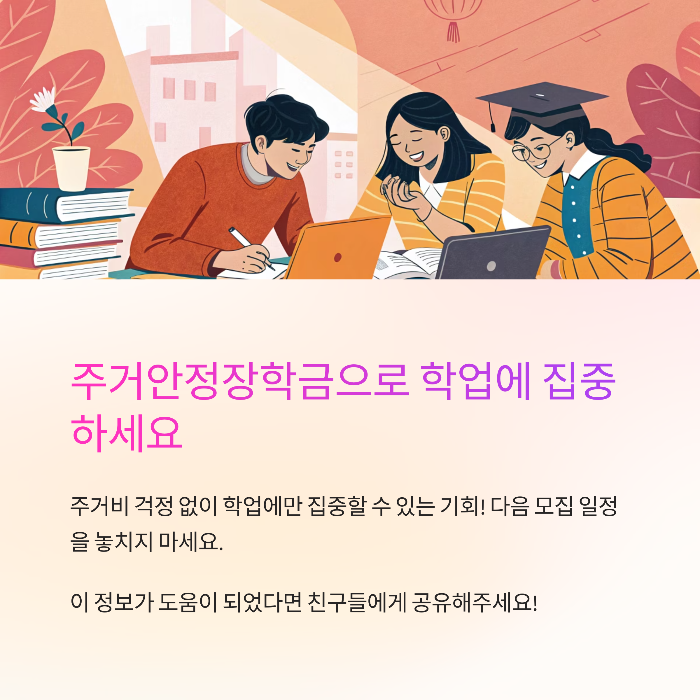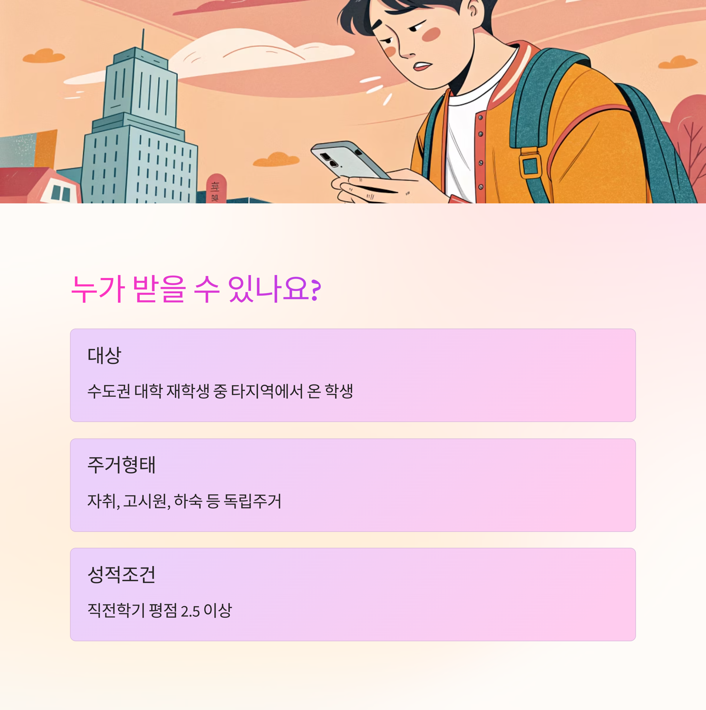 주거안정장학금은 주로 경제적으로 어려운 여건 속에서도 성실히 학업을 이어가고자 하는 대학생들을 대상으로 해요. 특히 타지역에서 서울이나 수도권 소재 대학에 재학 중이며, 자취나 고시원, 하숙 등 독립적인 주거를 유지하는 학생이 주된 대상이에요.