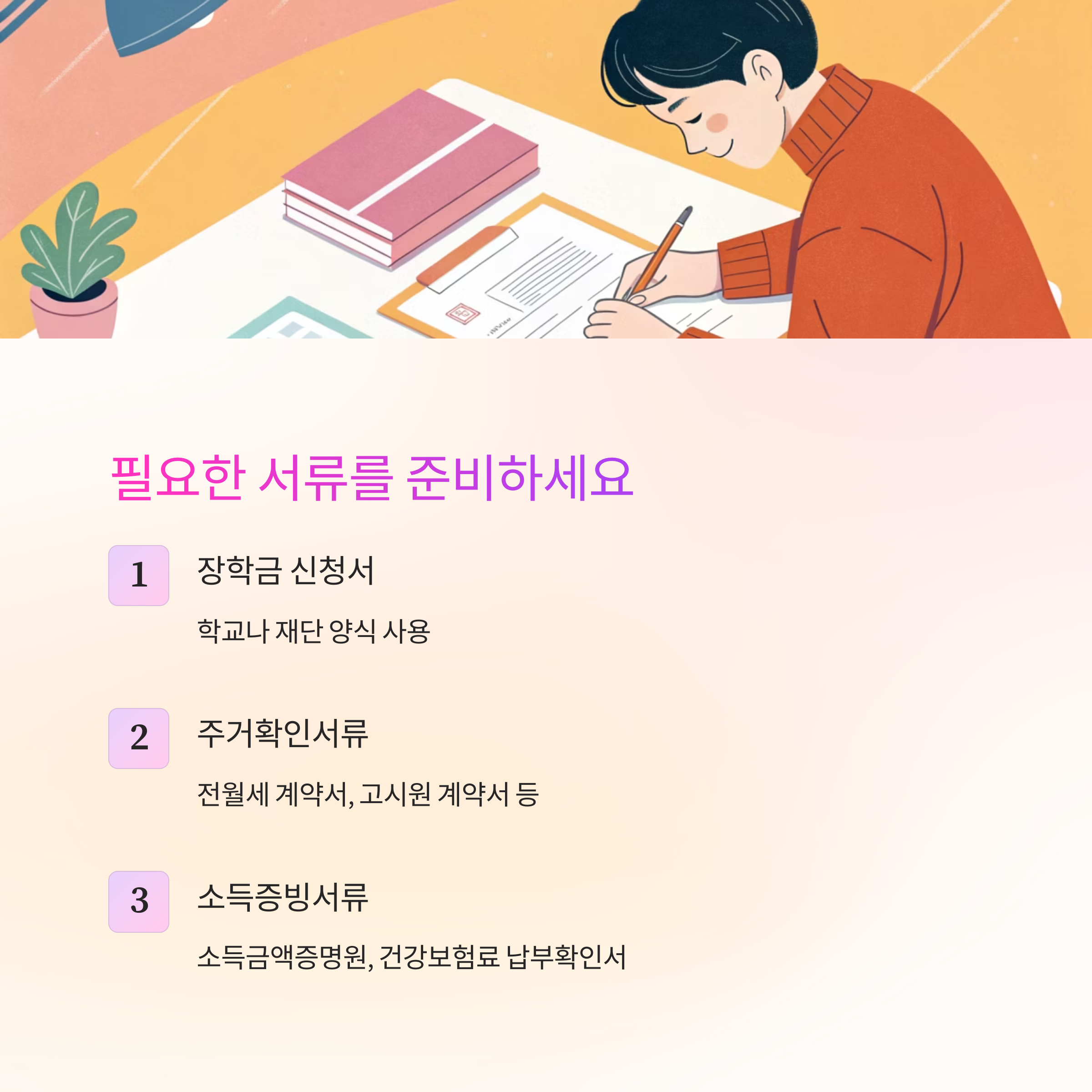 장학금 신청 시 요구되는 서류는 주거 상태와 경제적 상황을 증빙할 수 있는 자료들이에요. 빠짐없이 준비해야 심사에서 불이익이 없어요. 꼭 꼼꼼하게 확인하고 준비하세요!