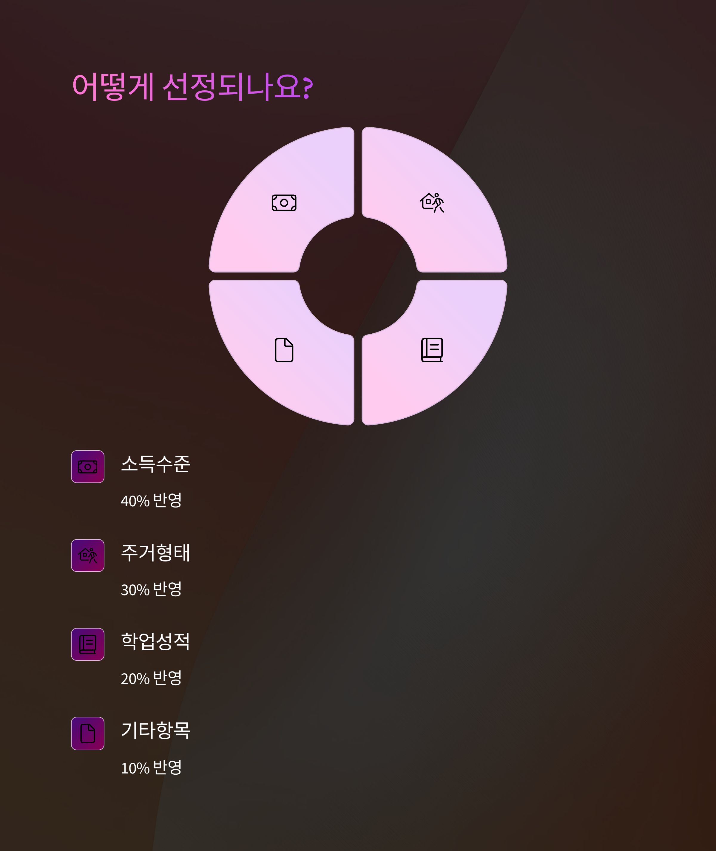 각 항목은 배점 기준에 따라 점수화되며, 총점이 높은 순서대로 예산 한도 내에서 수혜자가 선정돼요. 간혹 동일 점수자가 많을 경우, 생활기록부나 추가 자기소개서 등으로 심화 평가가 들어가기도 해요.