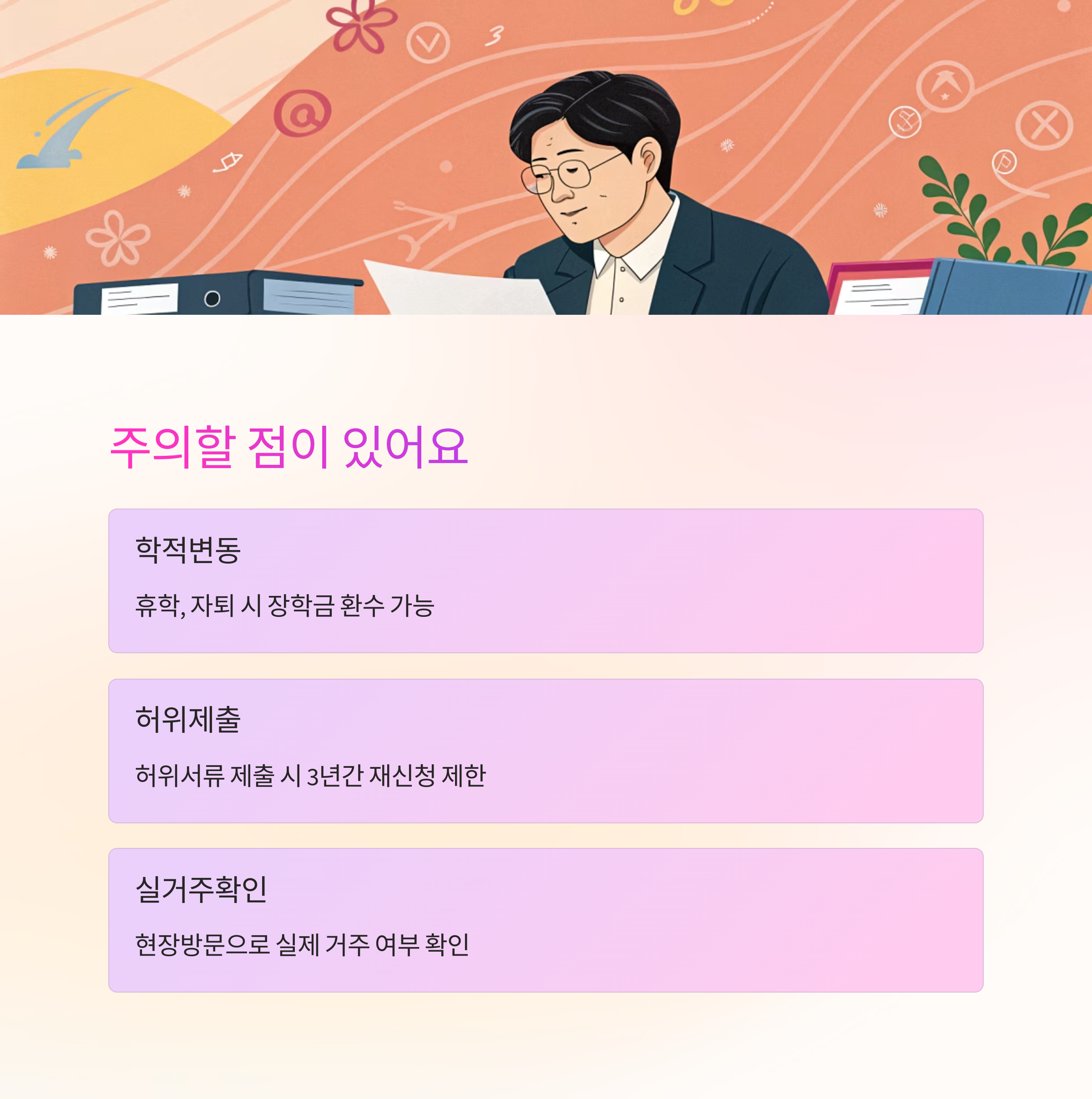 또한 허위 서류 제출이나 사실과 다른 주거 정보를 기재한 경우, 장학금 수혜는 물론 향후 3년간 재신청 자격이 제한될 수 있어요. 실거주 확인을 위해 현장 방문을 하는 경우도 있으니 투명한 신청이 가장 중요해요.