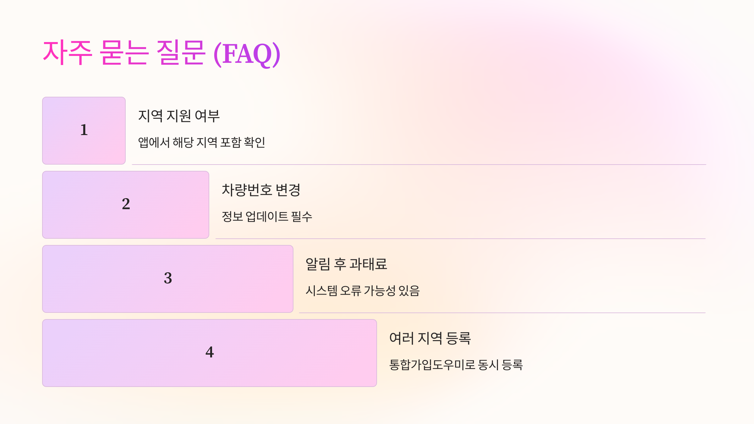3. 하루 알림 횟수 제한: 일부 지자체는 하루 알림 횟수가 제한돼 있어요. 잦은 이동이 있을 땐 주차 전에 수동으로 단속 구역 여부를 꼭 확인하세요.
