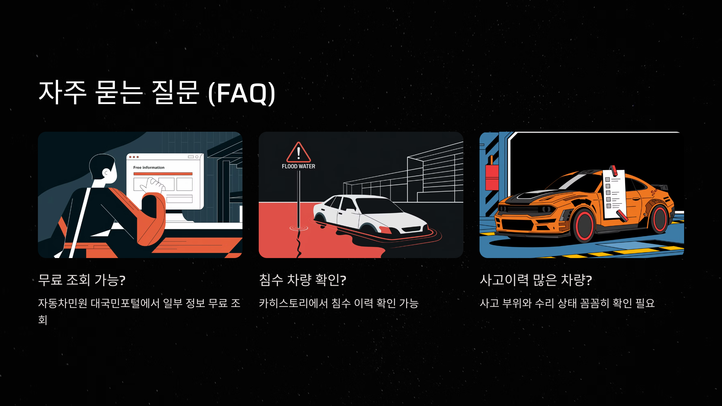 | 카히스토리 | 차량번호 또는 차대번호 입력 | 보험 사고, 침수, 렌트 이력 | 유료 |