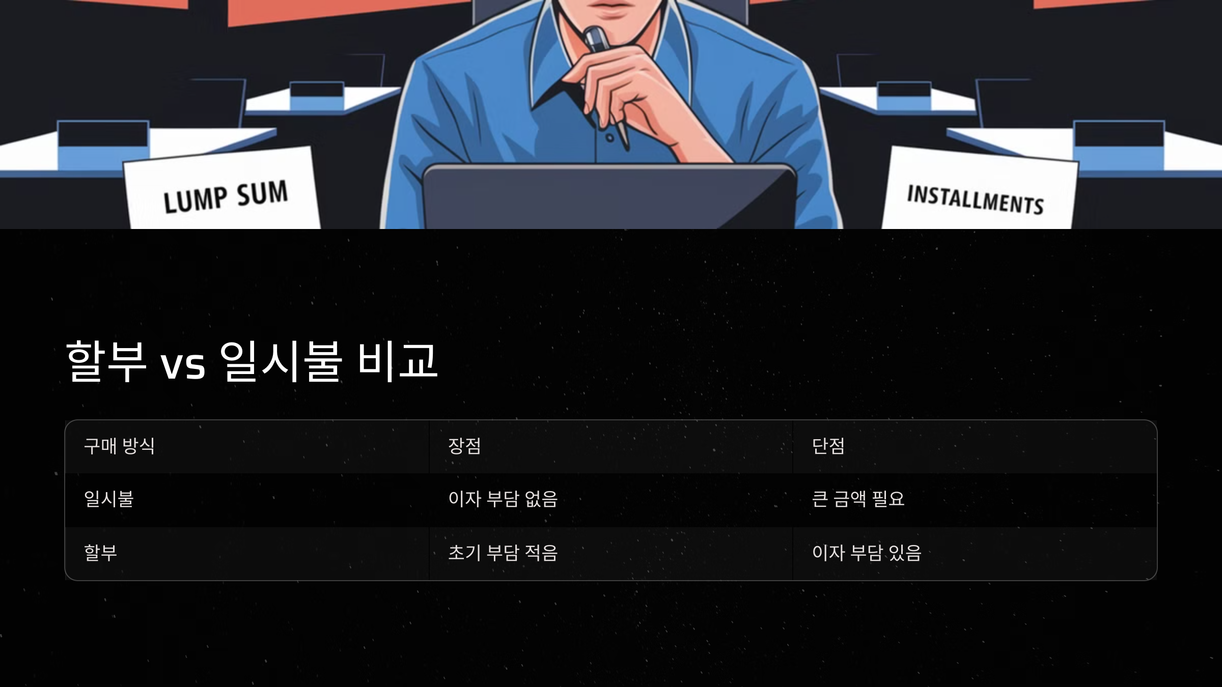 | 할부 | 초기 부담 적음 | 이자 부담 있음 |
