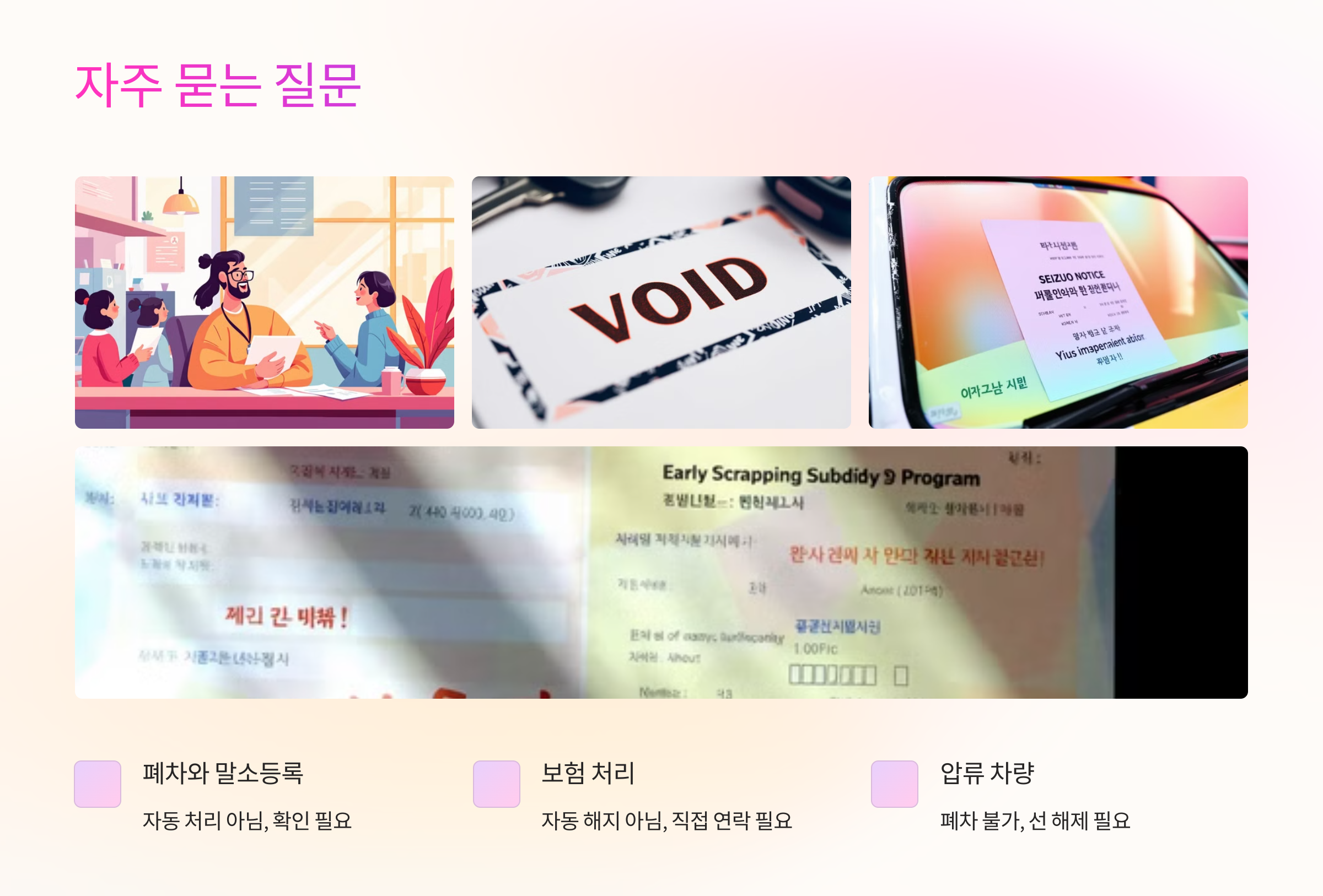두 절차는 보통 함께 진행되지만, 폐차를 했다고 해서 자동으로 말소되는 건 아니에요. 반드시 해체사가 말소를 대행해 주거나, 차량 소유자가 직접 차량등록사업소에서 말소 신청을 해야 해요.