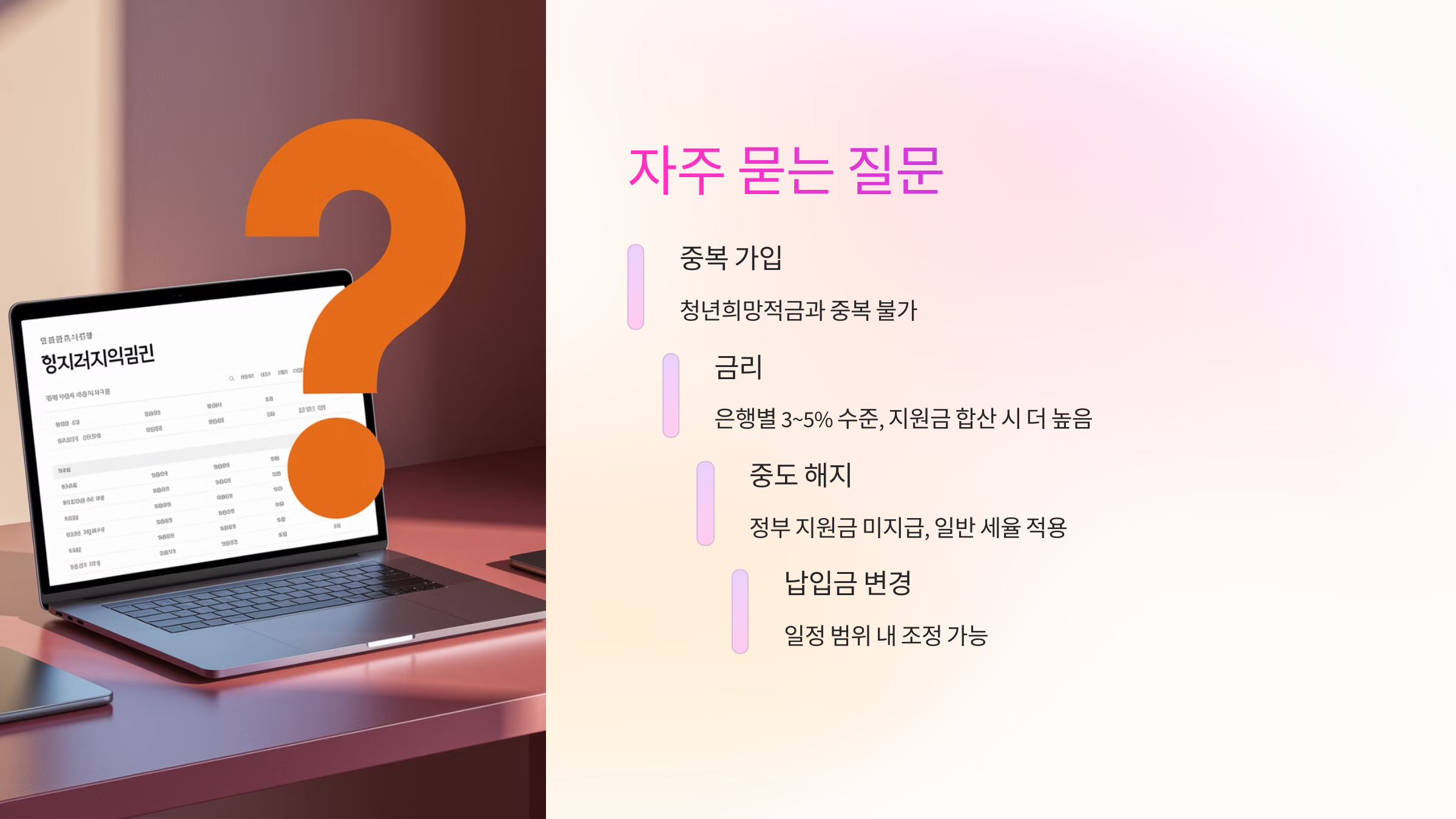 또한, 기존에 청년희망적금이나 다른 청년 지원 금융상품을 이용하고 있다면, 중복 가입이 불가능할 수도 있어요. 따라서 자신의 금융 상황을 미리 점검한 후 가입하는 것이 중요해요.