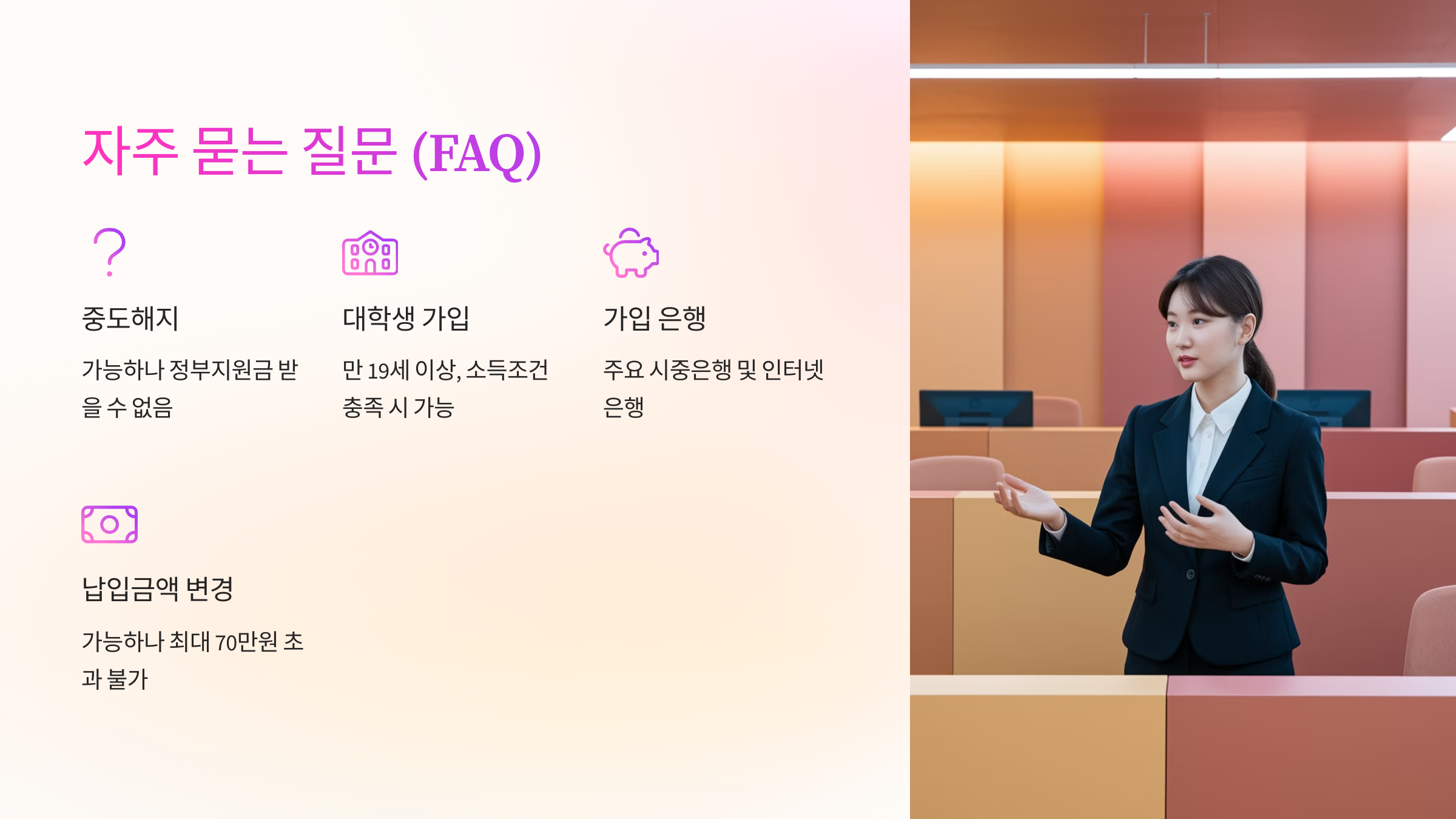 A1. 가능하지만, 중도 해지 시 정부 지원금을 받을 수 없고, 일부 은행에서는 이자율이 낮아질 수 있어요.