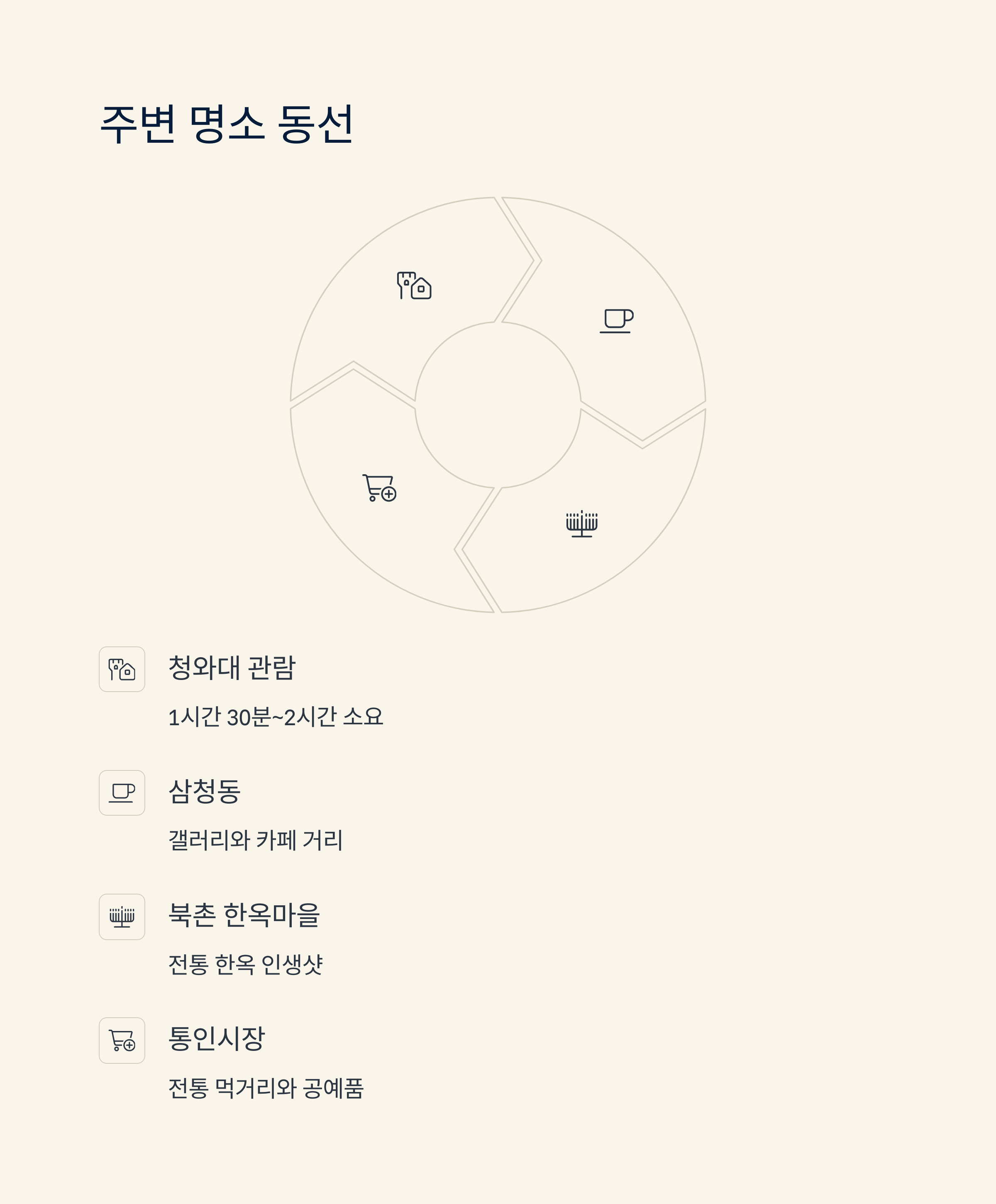 동선을 추천하자면 ‘청와대 관람 → 삼청동 → 북촌 → 인사동’ 루트를 추천해요. 도보 이동이 어렵지 않고, 중간중간 쉴 수 있는 장소도 많아서 하루 코스로 딱이에요.