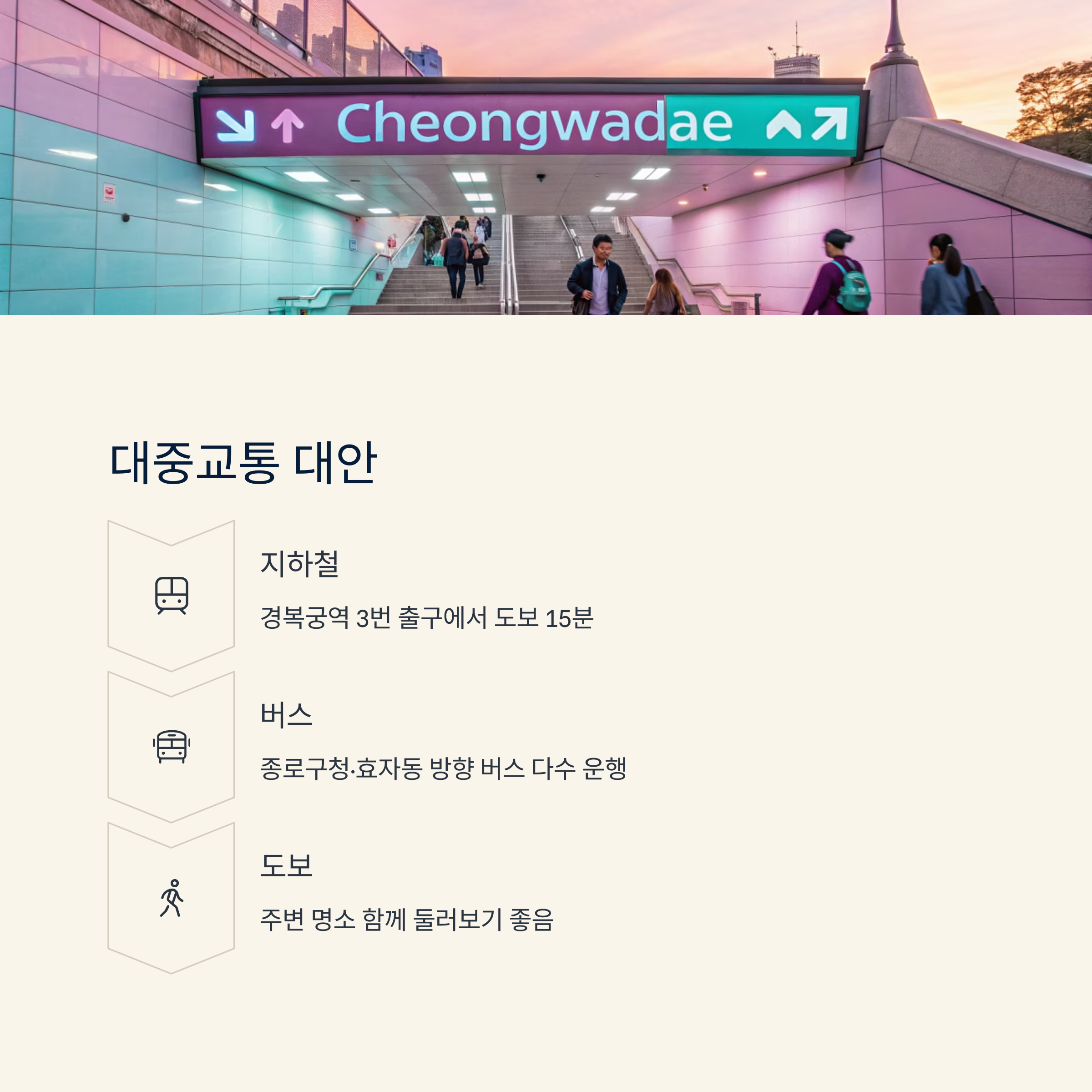 주말에 차를 가져가지 않고도 청와대 관람은 충분히 즐길 수 있어요. 특히 지하철 + 도보 조합이 가장 편리하고 효율적인 방식이에요. 경복궁역 3번 출구에서 도보로 약 15분 거리에 있어요.