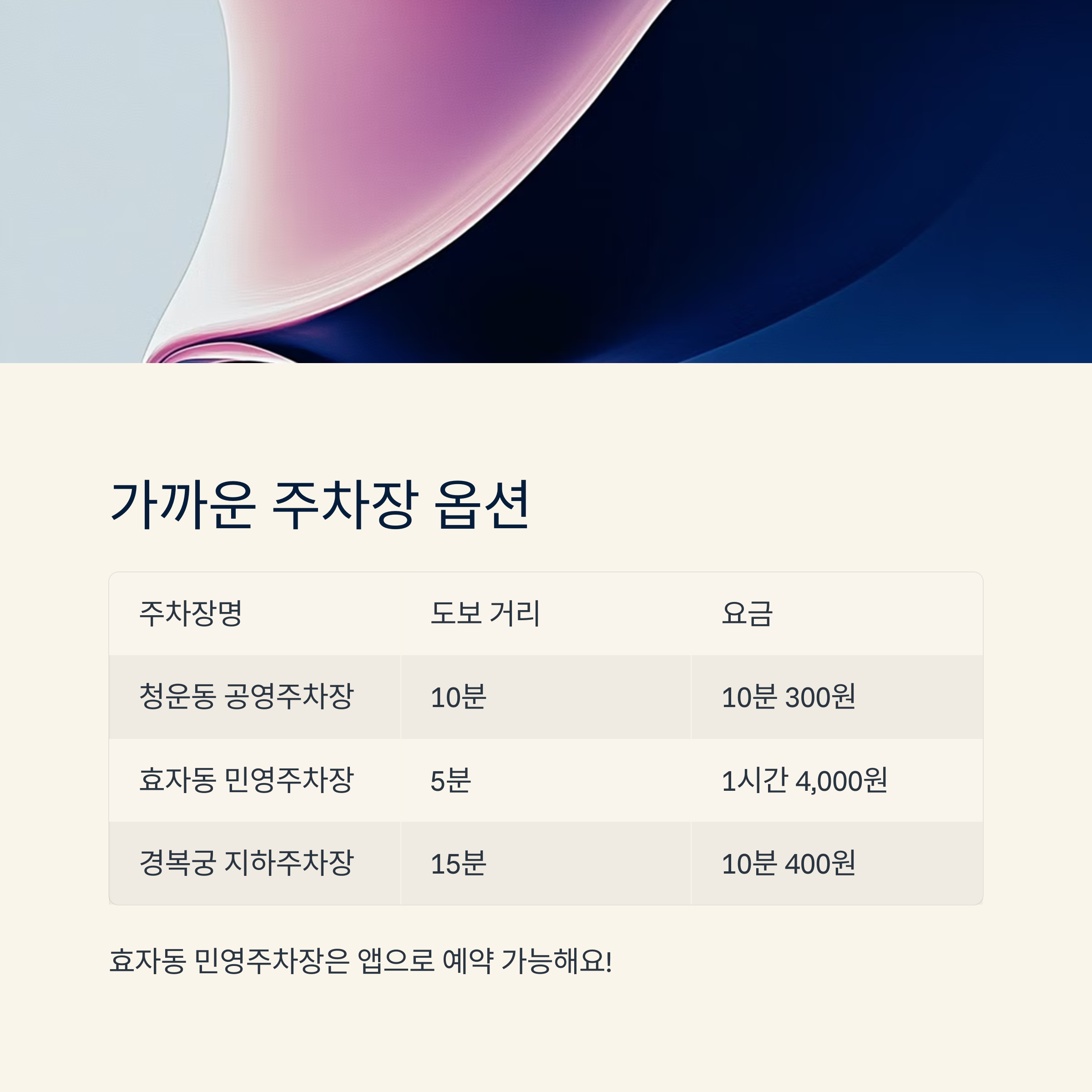 청운동 공영주차장은 도보 10분 거리로 무난한 위치예요. 단점은 자리가 많지 않아 오전 10시 이전에는 도착하는 게 좋답니다. 또 하나, 효자동에는 민간 유료주차장이 다수 있어 사전 예약이 가능한 곳도 있어요. '모두의 주차장' 앱을 통해 미리 예약하면 안심하고 이동할 수 있어요.