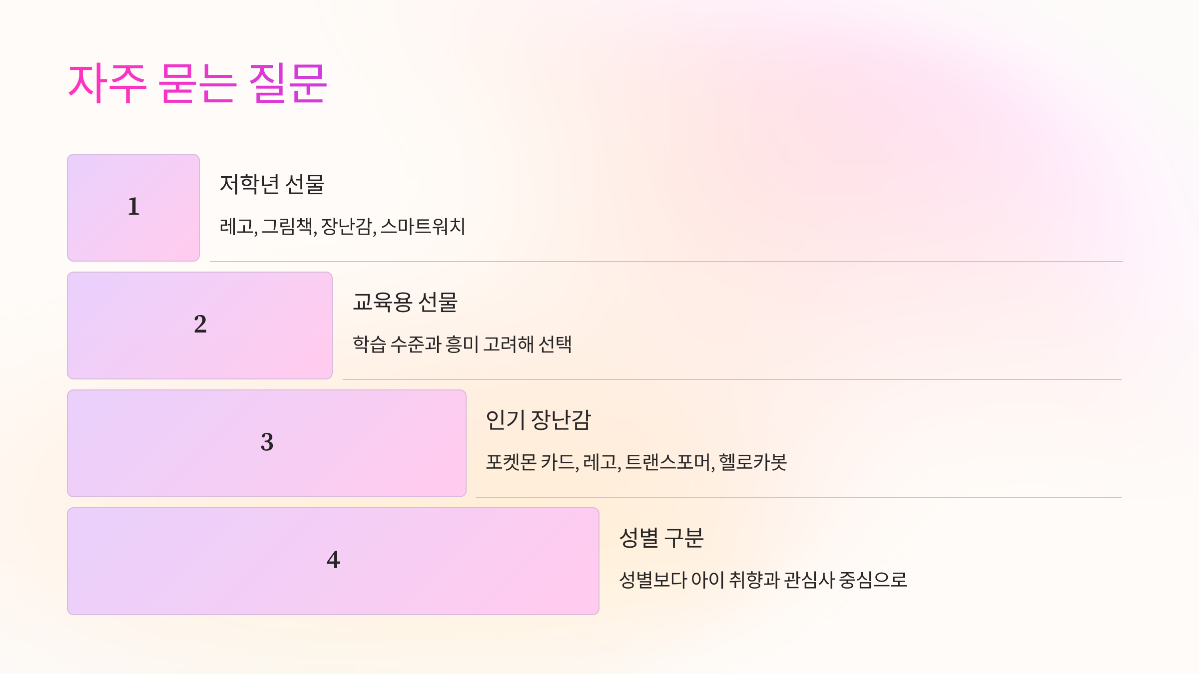 아이의 연령과 성향에 따라 어떤 유형이 가장 적절한지 고려하는 것이 중요해요. 장난감은 여전히 인기지만, 교육적 가치가 높은 선물도 아이의 흥미를 유도할 수 있답니다.