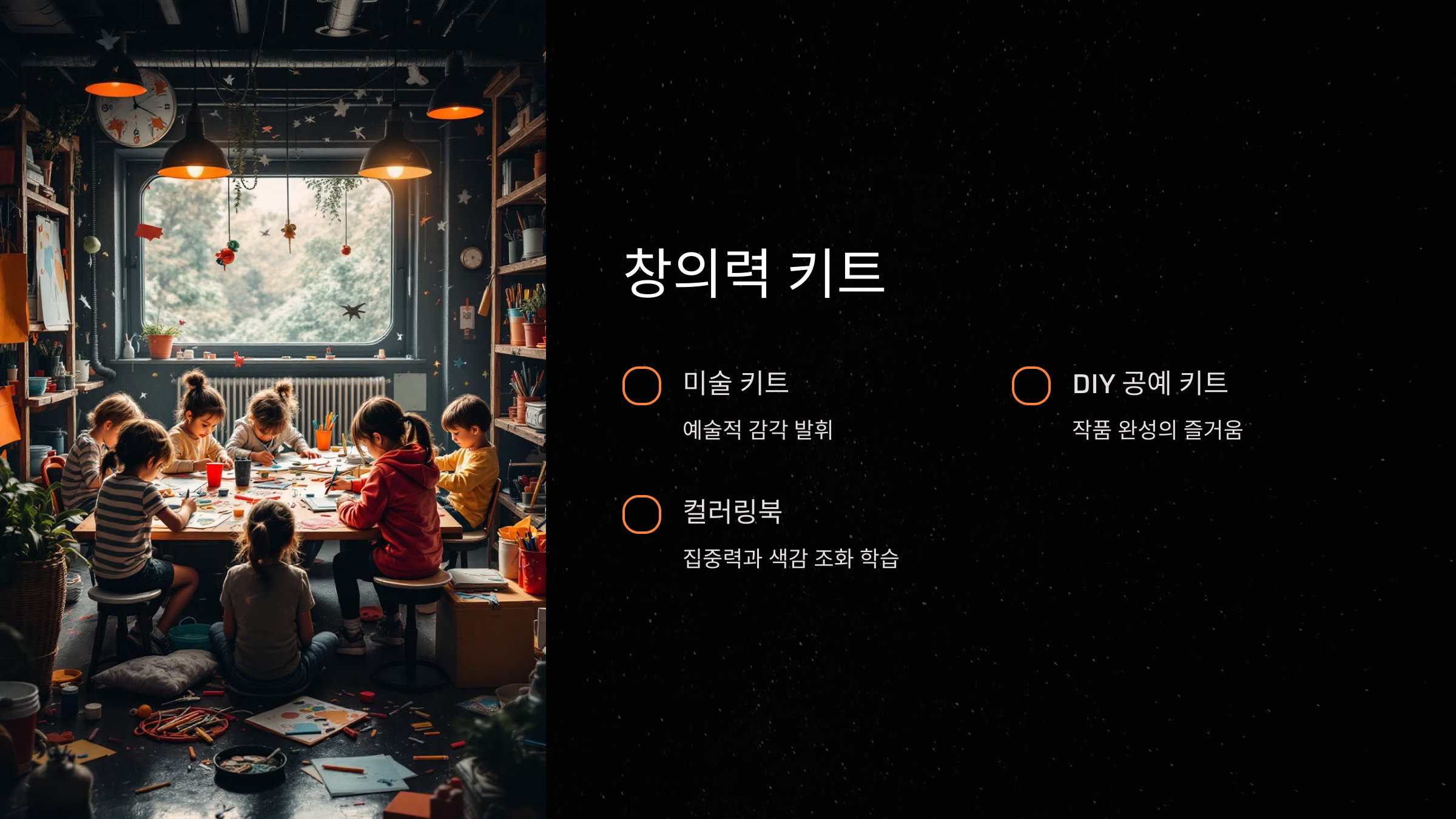 A. 미술 키트, DIY 공예 키트, 과학 실험 키트가 창의성을 발휘하게 합니다.