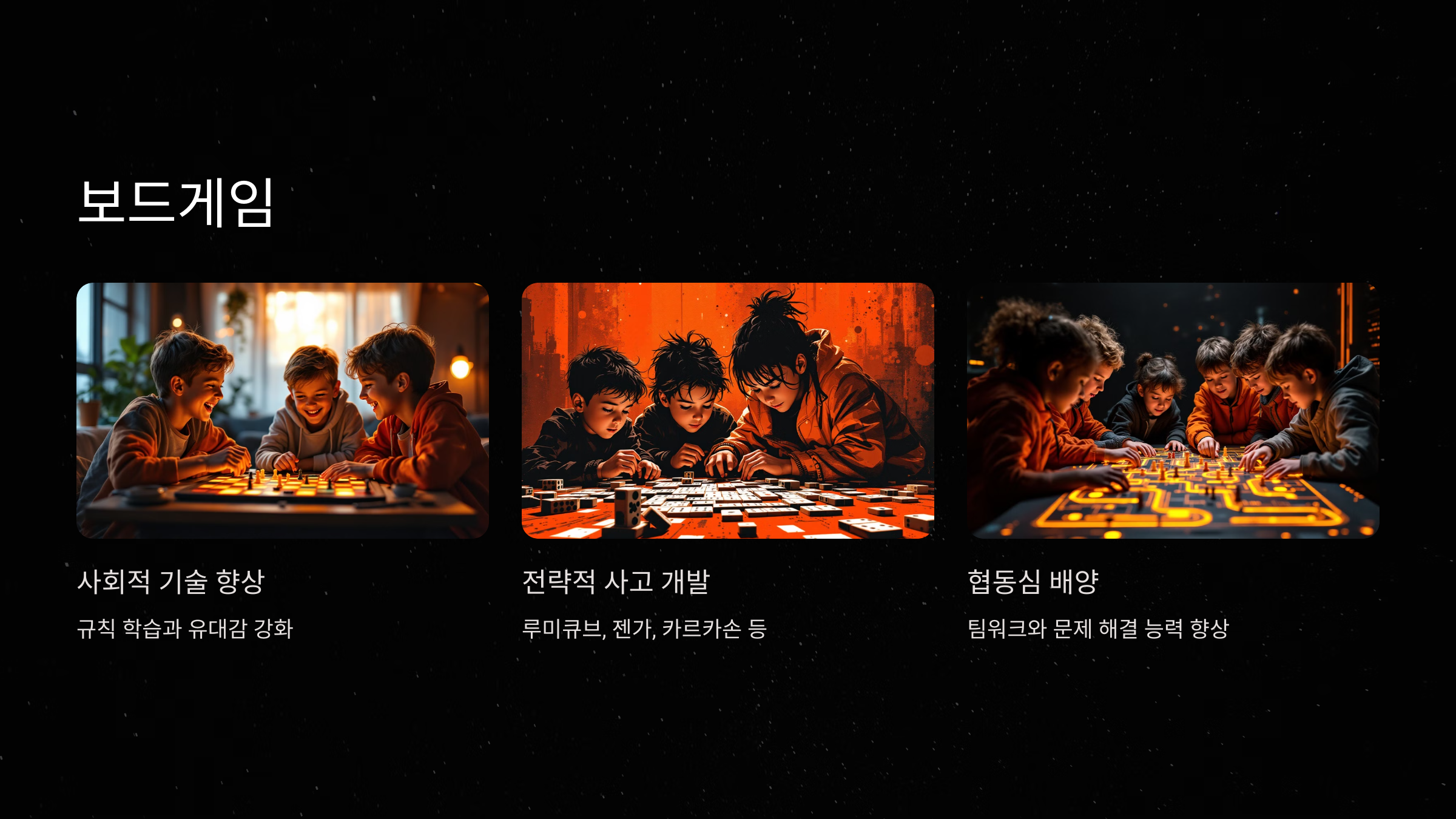- 협동형 보드게임은 팀워크를 배우고 친구와의 협력을 통해 문제를 해결하는 방법을 익힐 수 있습니다.