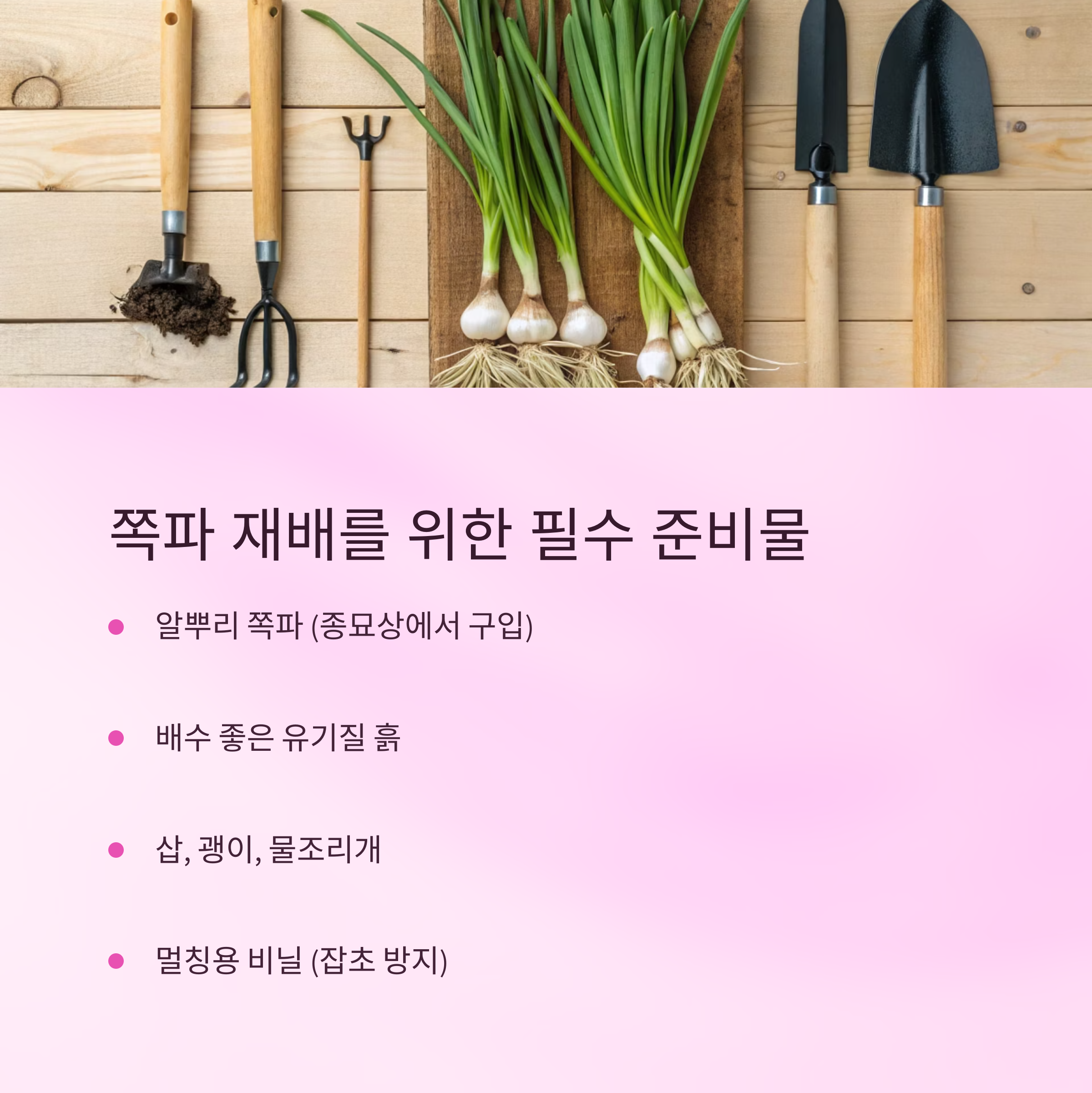 준비물은 간단해요. 알뿌리 쪽파, 삽이나 괭이, 퇴비 또는 유박비료, 물조리개, 그리고 거름망이나 멀칭용 비닐 정도면 충분해요. 도시에서 키우는 분들은 화분이나 플랜터 박스를 활용해도 문제없어요!