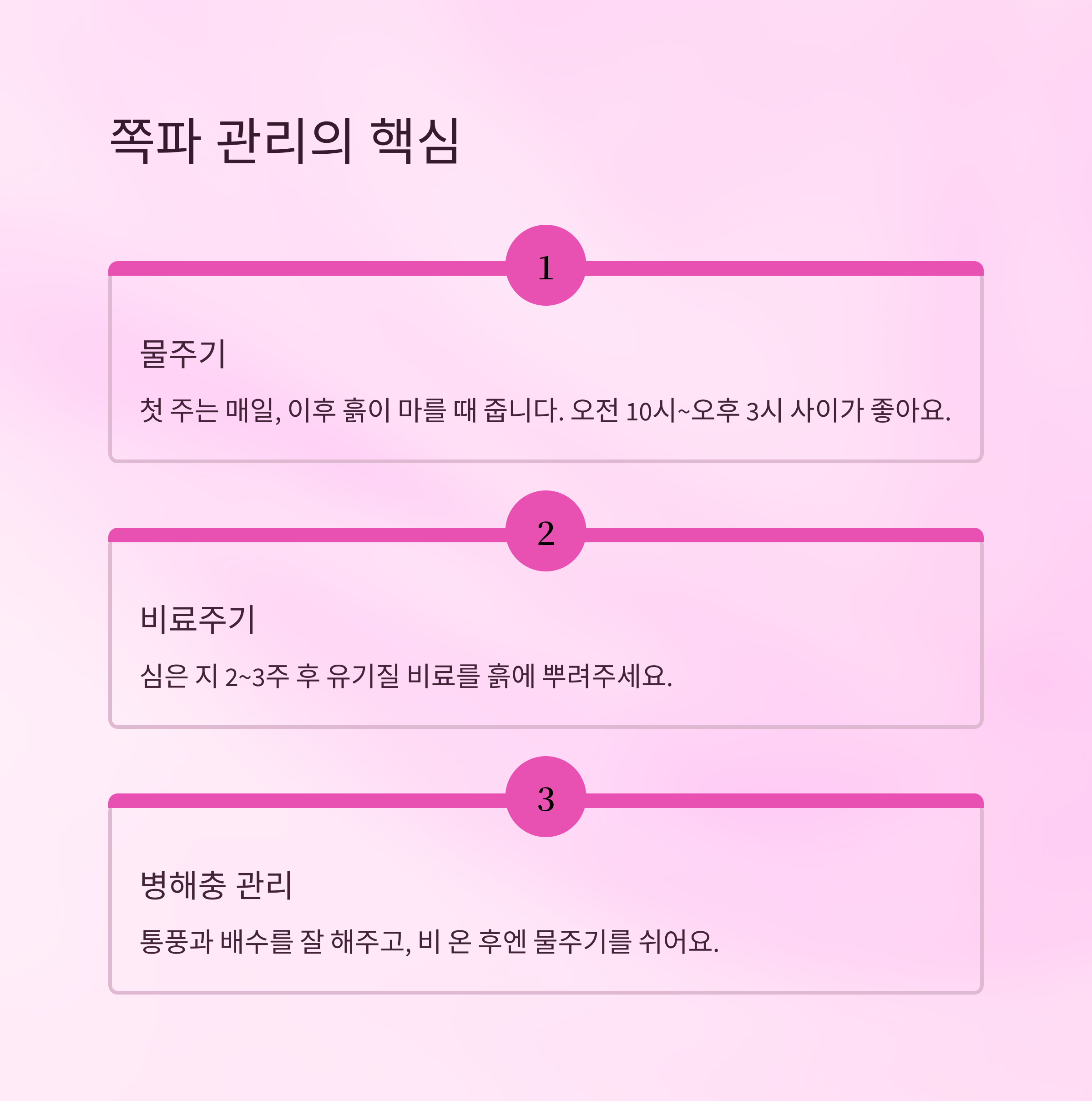 | 비료 | 2~3주 후 | 유박비료나 액비 | 잎에 닿지 않도록 |