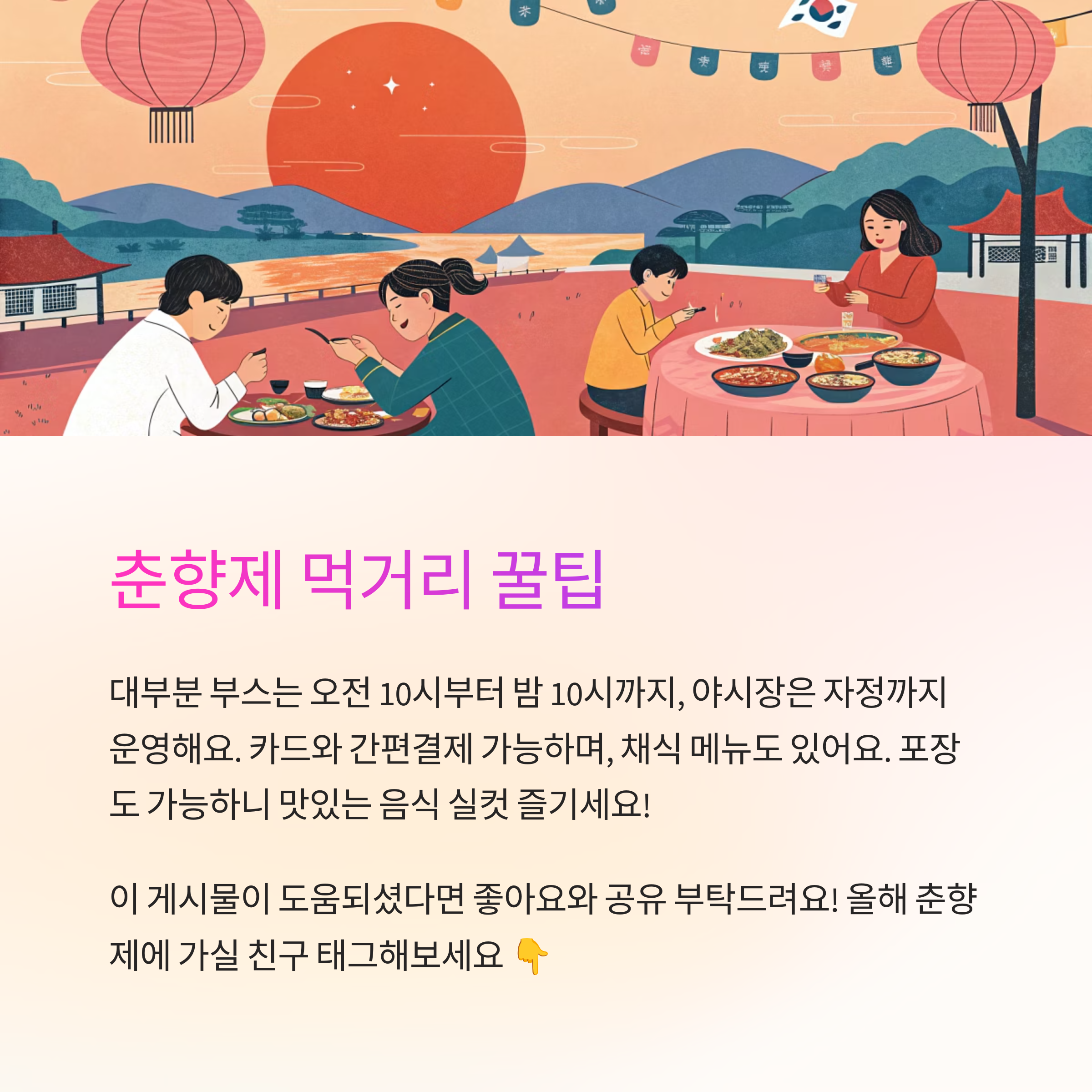 이 야시장만의 분위기는 축제를 또 다른 각도에서 즐길 수 있게 해줘요. 가족, 연인, 친구와 함께 손에 음식을 들고 천천히 걸으며 야경을 감상하다 보면, 이 시간이 얼마나 소중한지 절로 느껴지죠. 밤이 깊어도 춘향제의 열기는 사그라들지 않아요 🔥