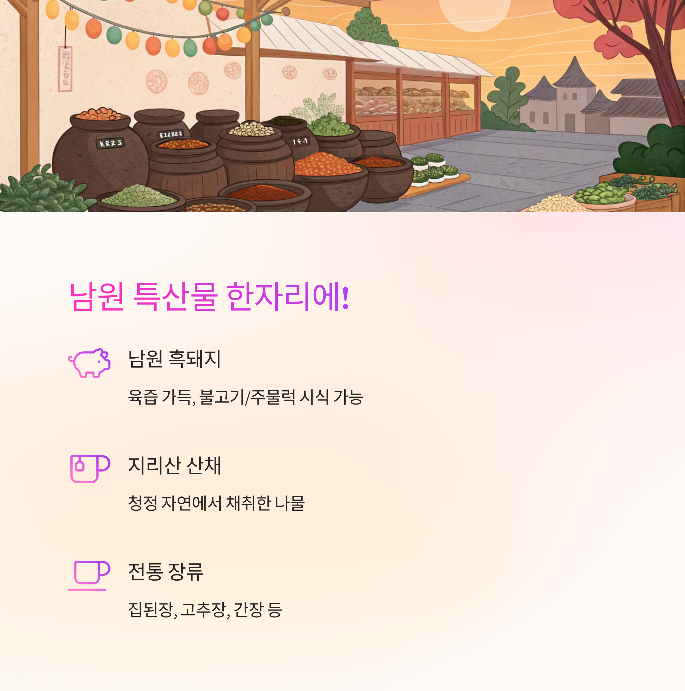 | 남원 흑돼지 | 풍부한 육즙, 부드러운 식감 | 생고기/조리식/포장 세트 |