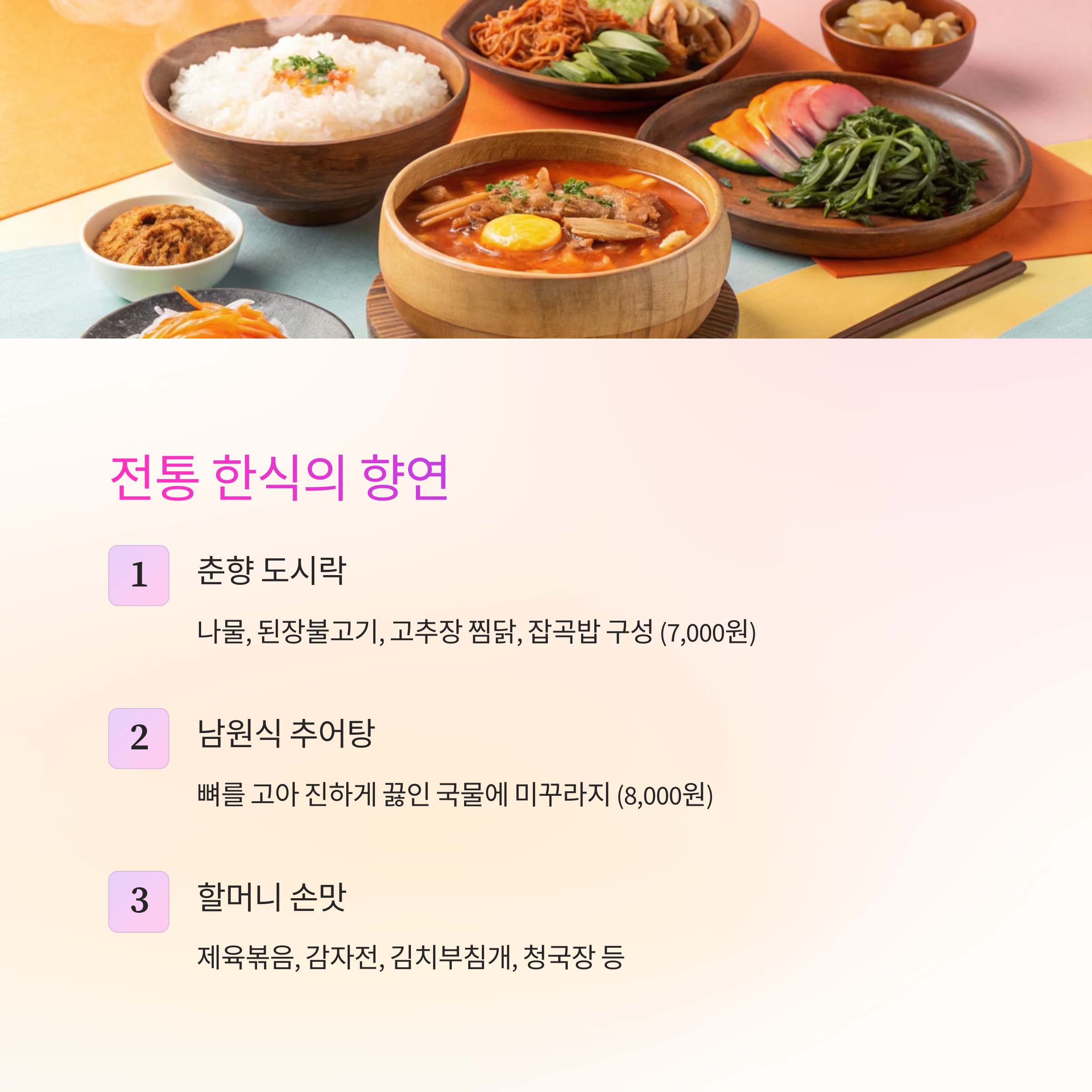 | 춘향 도시락 | 전통 반찬 6종 구성 | 7,000 |