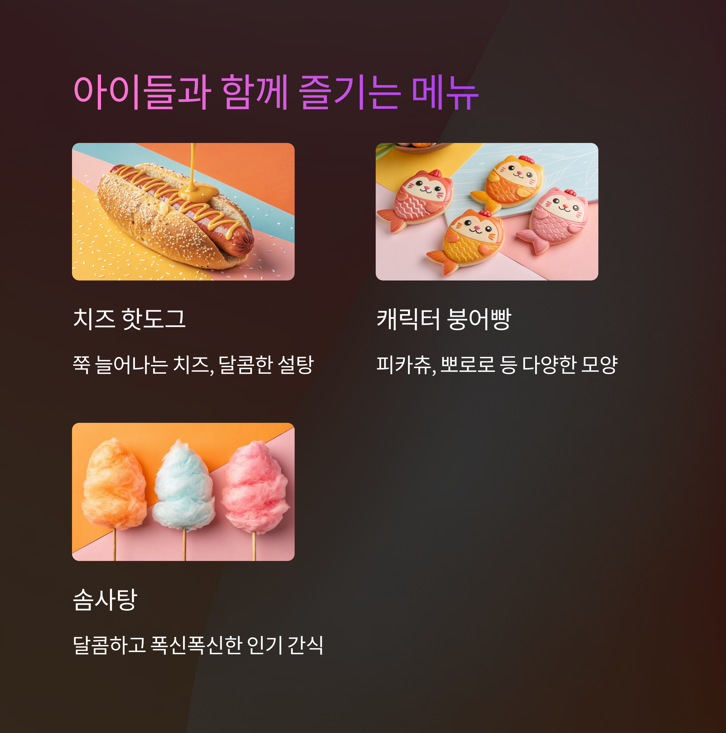 A4. 물론이죠! 치즈 핫도그, 솜사탕, 계란빵, 주먹밥 등 자극적이지 않고 안전한 메뉴들이 많아서 안심이에요.