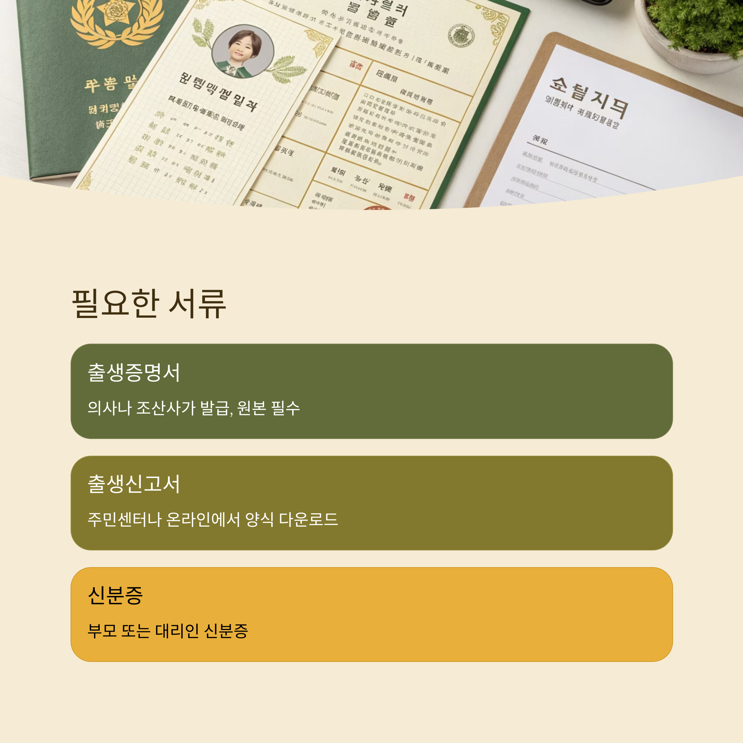 가장 중요한 서류는 출생증명서예요. 이는 의사나 조산사가 발급하며, 아기의 이름, 성별, 출생일시, 출생 장소, 출산한 산모의 정보 등이 포함되어 있어요. 출생증명서는 원본을 제출해야 하며, 복사본은 인정되지 않아요.