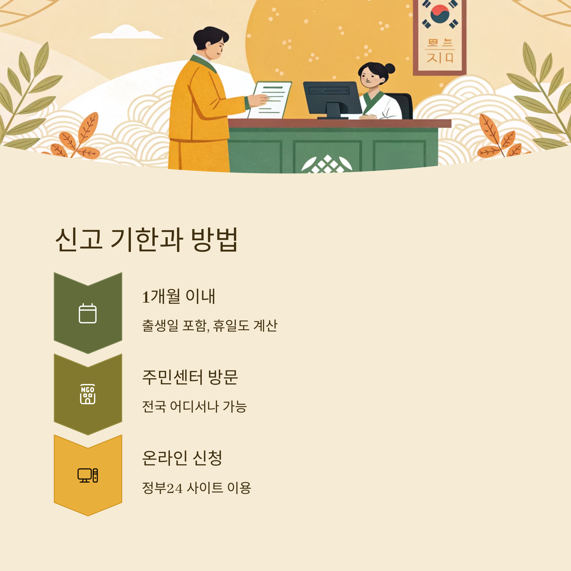 출생신고는 출생일로부터 1개월 이내에 해야 해요. 이 1개월은 출생 당일을 포함해서 계산하며, 휴일과 공휴일도 포함된다는 점 꼭 기억해두세요. 신고 기한을 넘기면 과태료가 부과될 수 있으니 가능한 한 빠르게 신고하는 것이 중요해요.