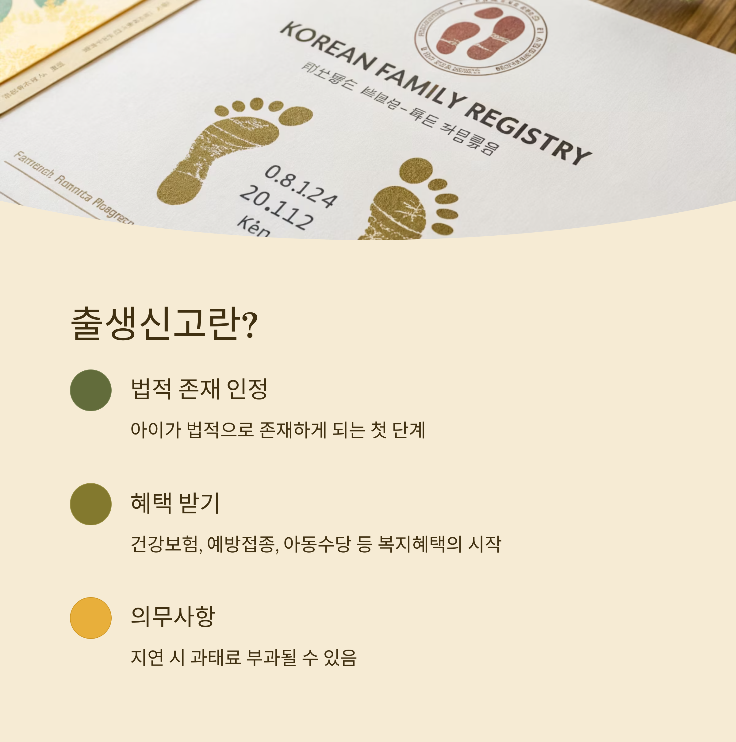 이 신고를 통해 아이는 가족관계등록부에 등재되고, 건강보험, 예방접종, 아동수당 등의 각종 복지 혜택도 받을 수 있게 돼요. 출생신고가 이루어지지 않으면 국가 행정 시스템 안에 존재하지 않는 것이나 마찬가지기 때문에, 나중에 큰 불이익을 당할 수 있어요.
