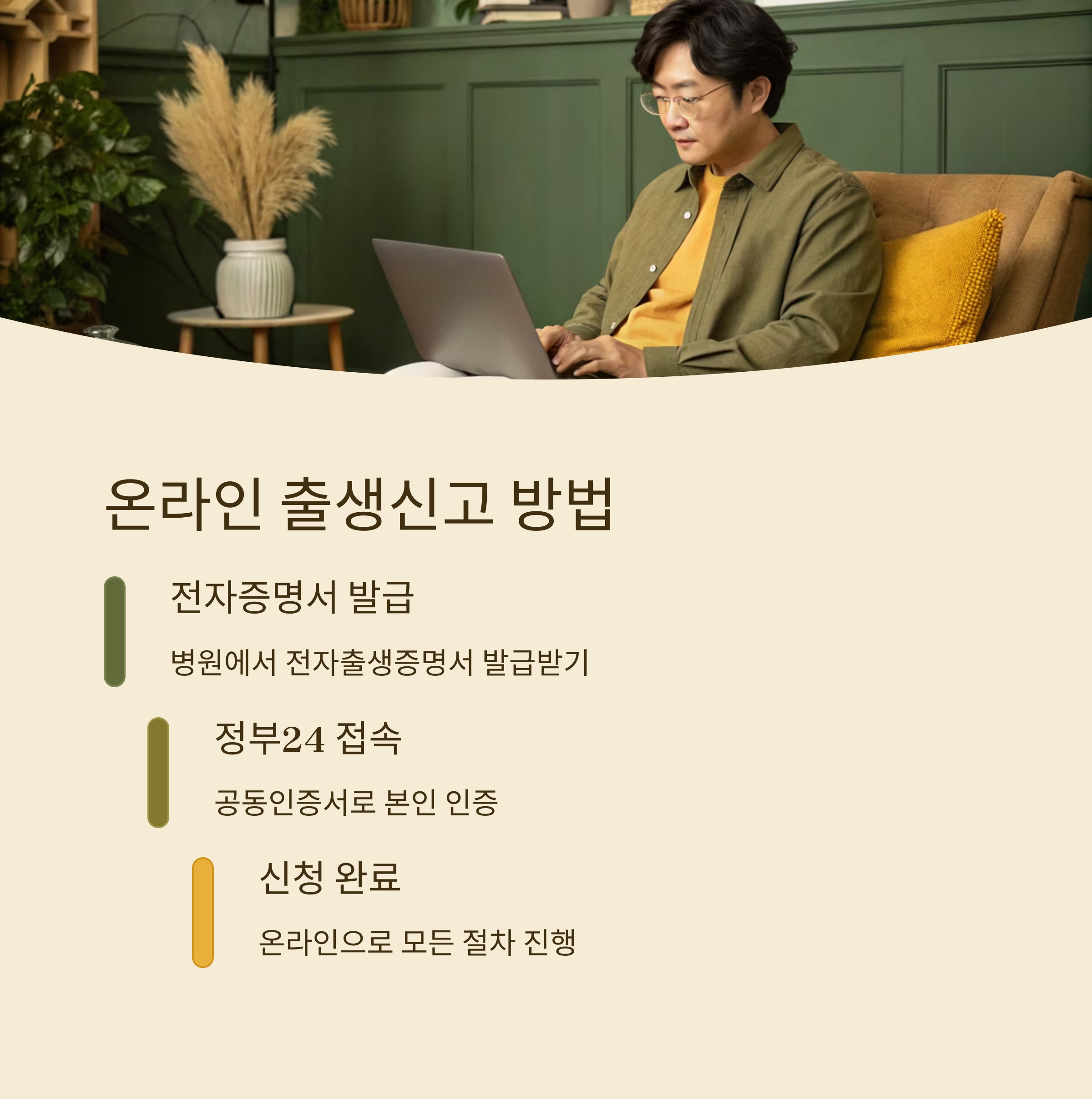 온라인 출생신고는 정부24(www.gov.kr)를 통해 신청할 수 있어요. 병원에서 출생사실을 전자증명서로 발급해주면, 이를 바탕으로 부모가 인증을 거쳐 온라인으로 출생신고를 완료할 수 있답니다.