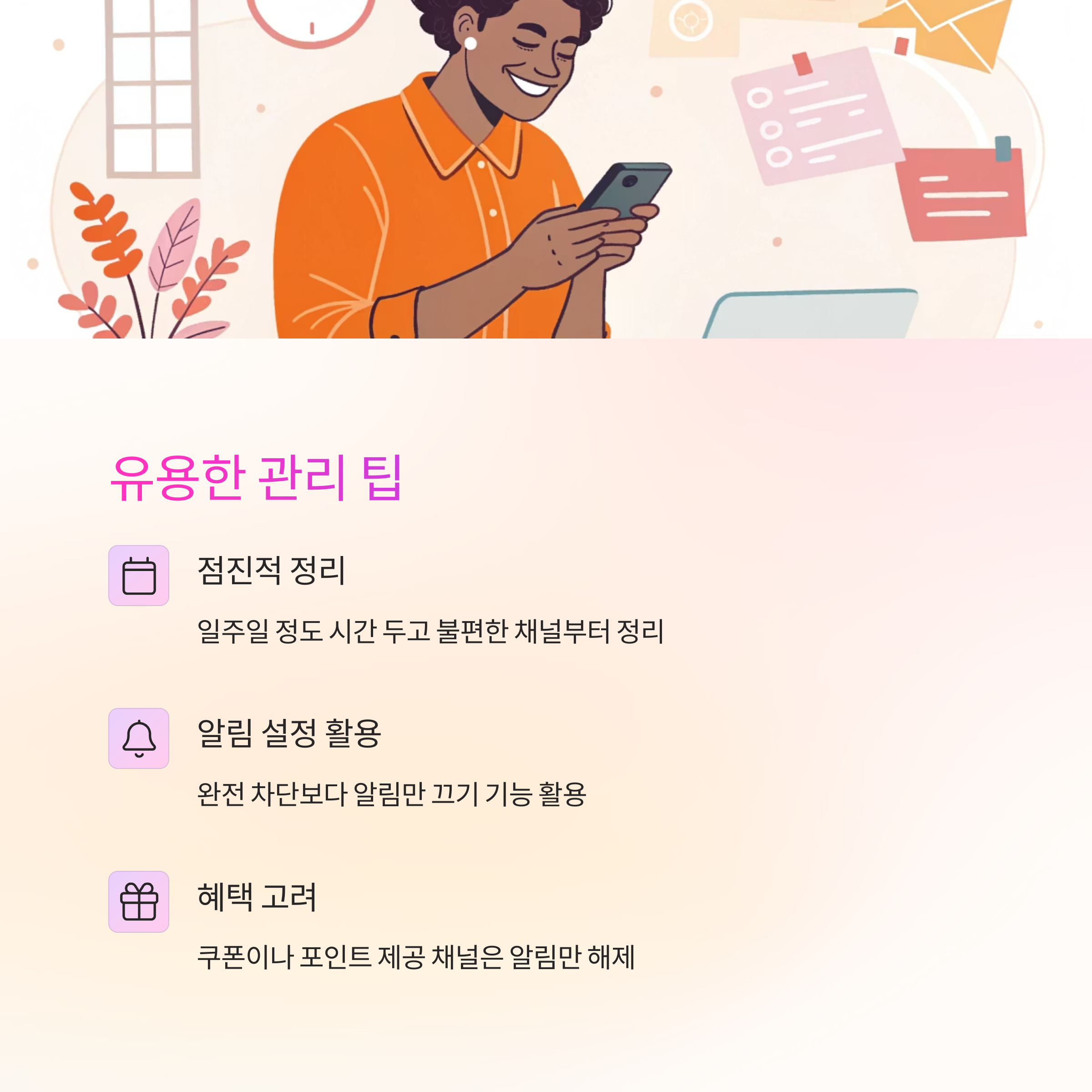 4. 이벤트 쿠폰이나 포인트를 자주 사용하는 채널은 차단하지 말고 알림만 꺼두는 것이 더 현명해요.