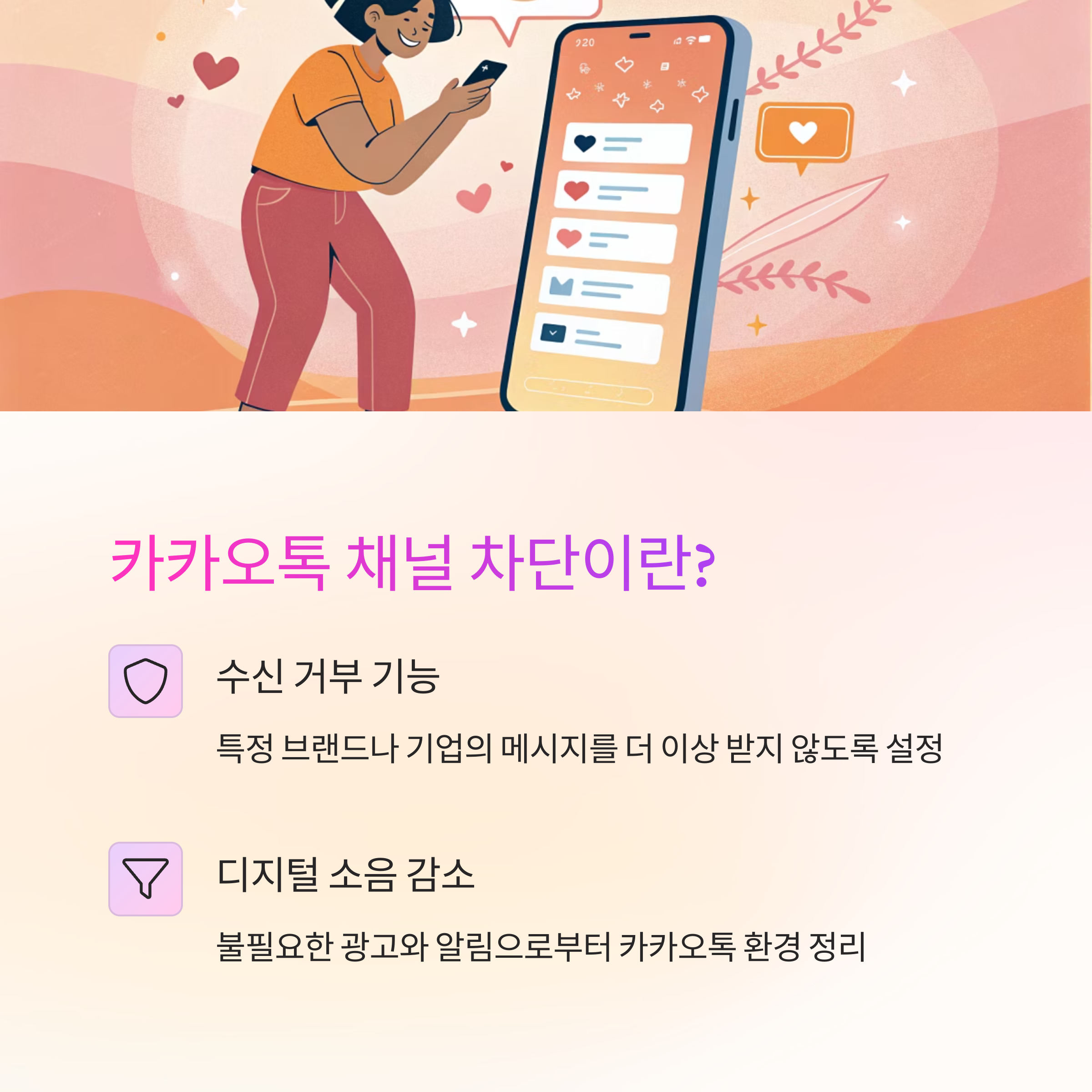 카카오톡 채널은 광고성 메시지, 이벤트 알림, 신상품 출시 소식 등을 고객에게 실시간으로 전달하기 위해 활용되는데요, 소비자 입장에서 너무 많은 메시지가 오면 피로감이 생기기 마련이에요. 그럴 때 불필요한 채널을 간편하게 차단하면, 내 카카오톡 환경을 더 쾌적하게 만들 수 있어요. 😊