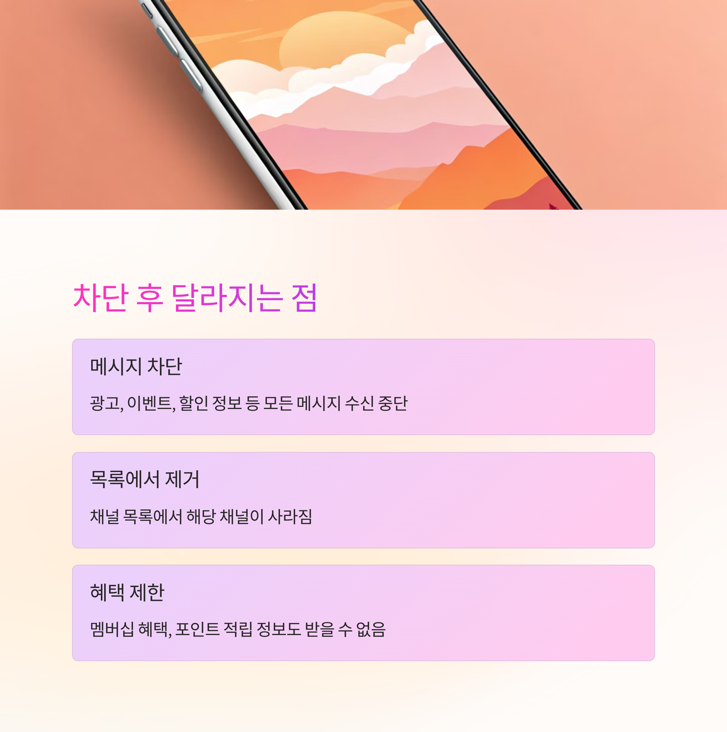 다만, 차단 시 해당 채널이 제공하는 멤버십 혜택이나 포인트 적립 정보도 더 이상 받을 수 없으니, 이 점은 꼭 고려한 후 결정하는 게 좋아요.