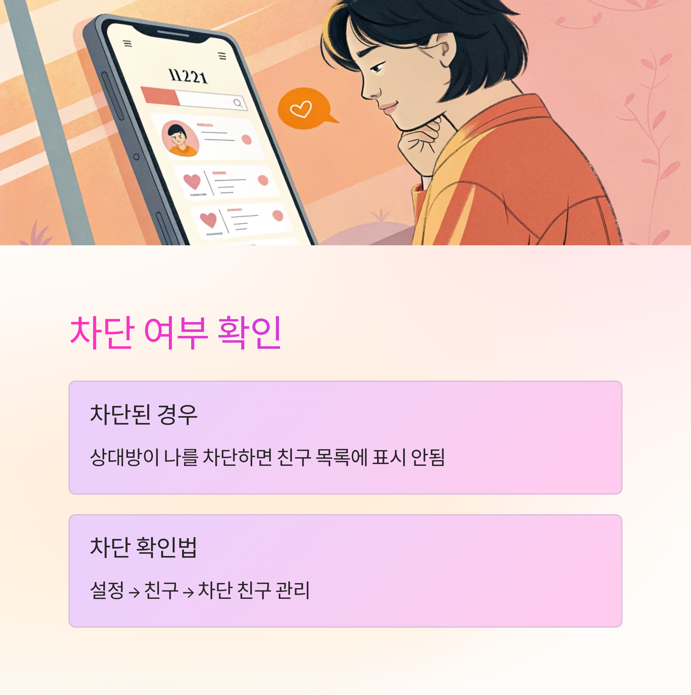 내가 상대를 차단했는지 확인하려면 '설정 → 친구 → 차단 친구 관리'로 가보세요. 거기에 상대 이름이 있다면 차단되어 있는 거예요. 필요 시 차단 해제를 통해 다시 친구 목록에 추가가 가능해요.