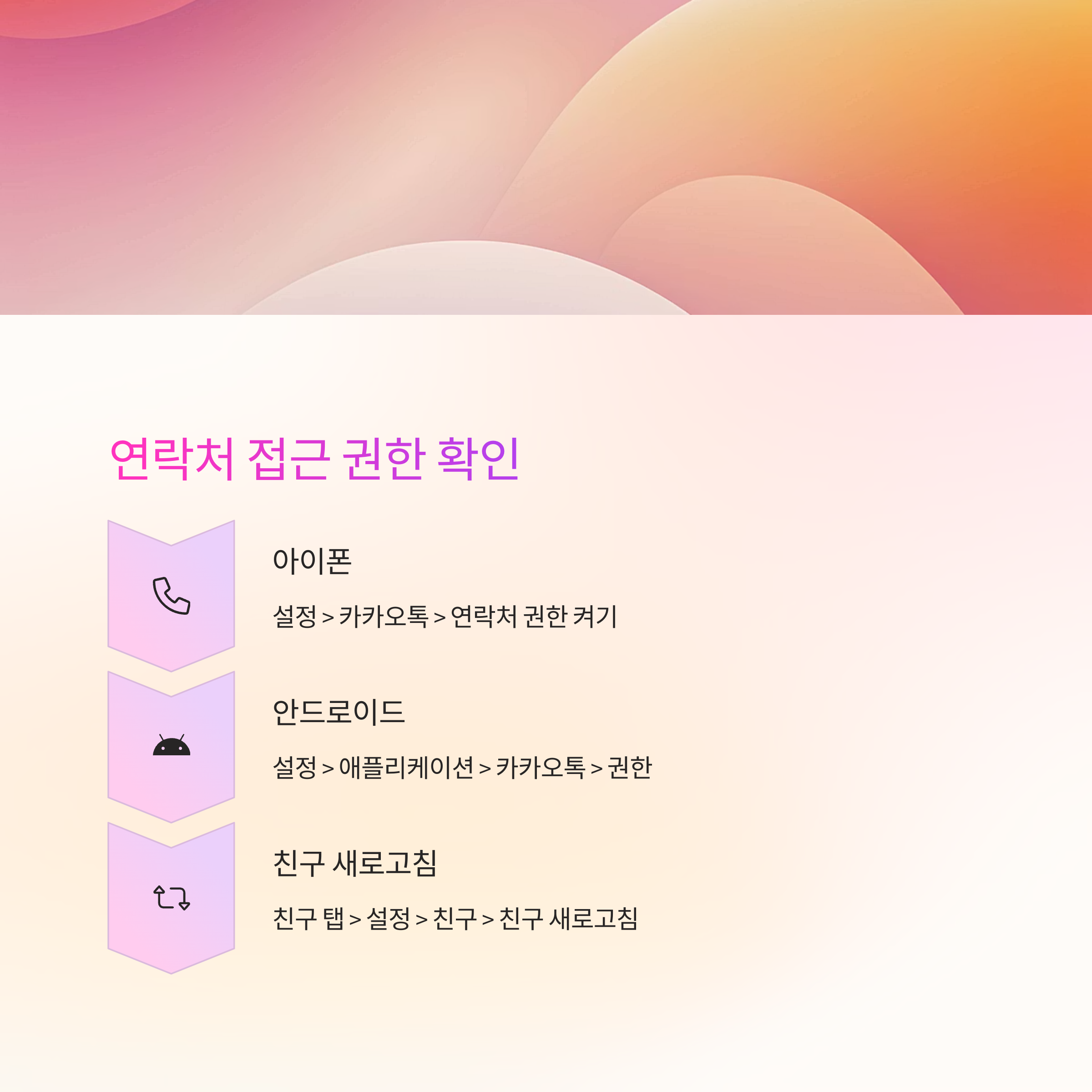 권한이 이미 켜져 있음에도 친구가 목록에 나타나지 않는다면, 카카오톡 앱 내 설정에서 '친구 새로고침'을 눌러주는 것도 좋아요. 친구 탭 오른쪽 위 설정 아이콘 > 친구 > 친구 새로고침 순서로 들어가면 돼요.