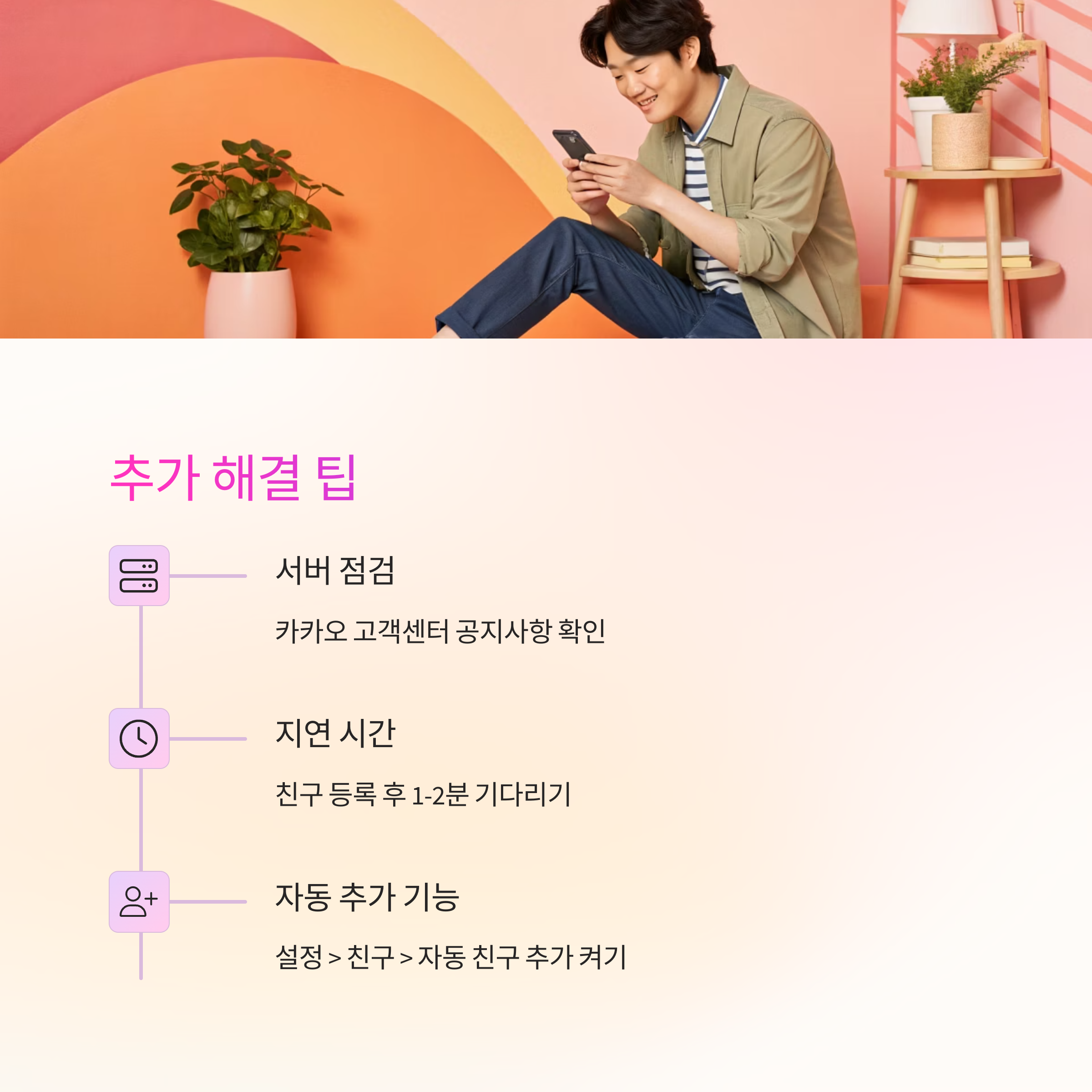 또한 상대방이 전화번호를 바꿨는데, 내 연락처가 업데이트되지 않아서 생기는 문제도 많아요. 이럴 땐 연락처 동기화를 다시 해보는 것이 좋아요. 설정 > 친구 > 친구관리에서 '자동 친구 추가'를 껐다가 다시 켜보세요.