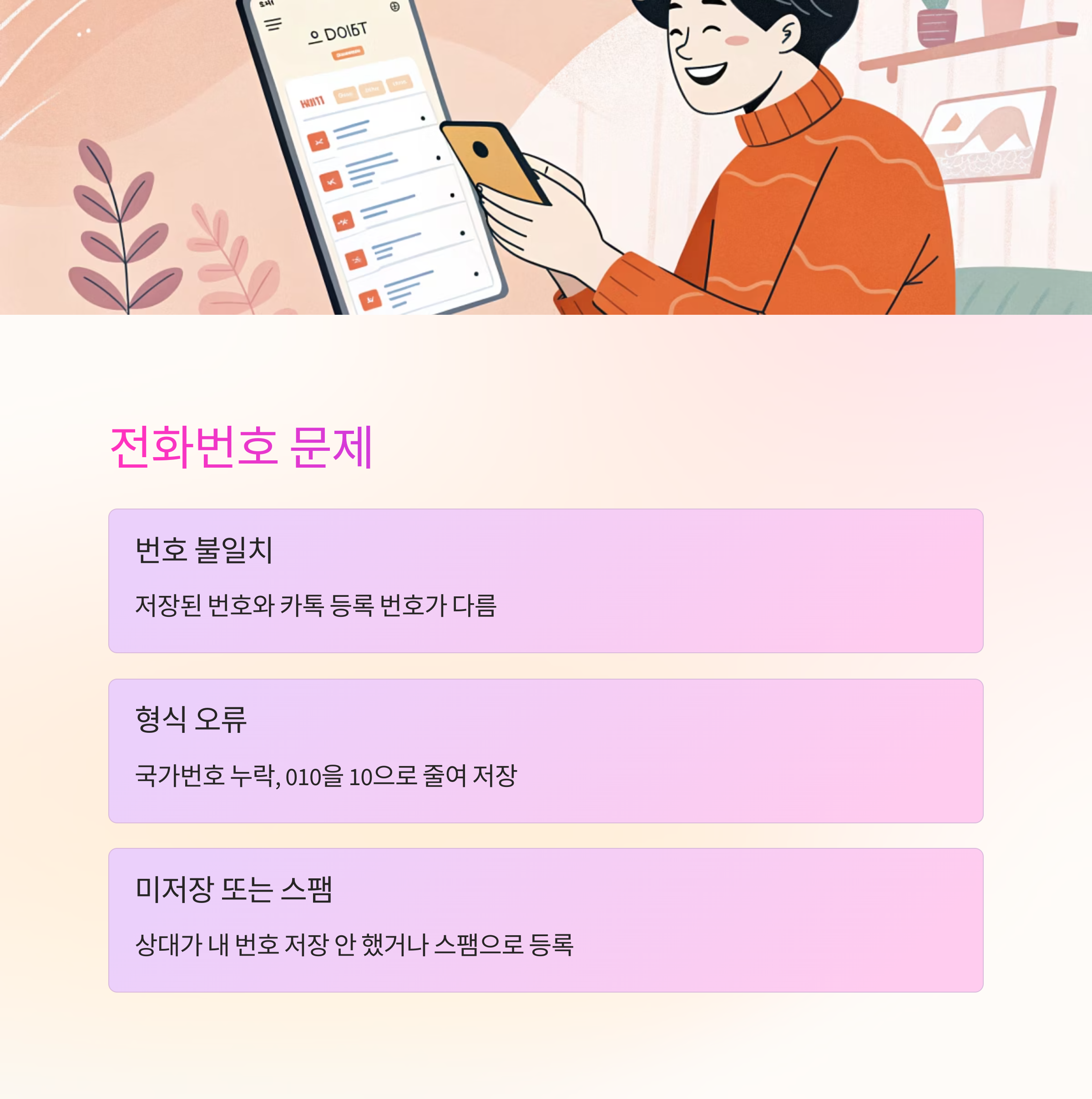 가장 기본적이지만 자주 놓치는 부분이 전화번호예요. 연락처에 저장된 번호와 상대방의 카카오톡 계정에 등록된 번호가 일치하지 않으면 친구로 자동 추가되지 않아요.