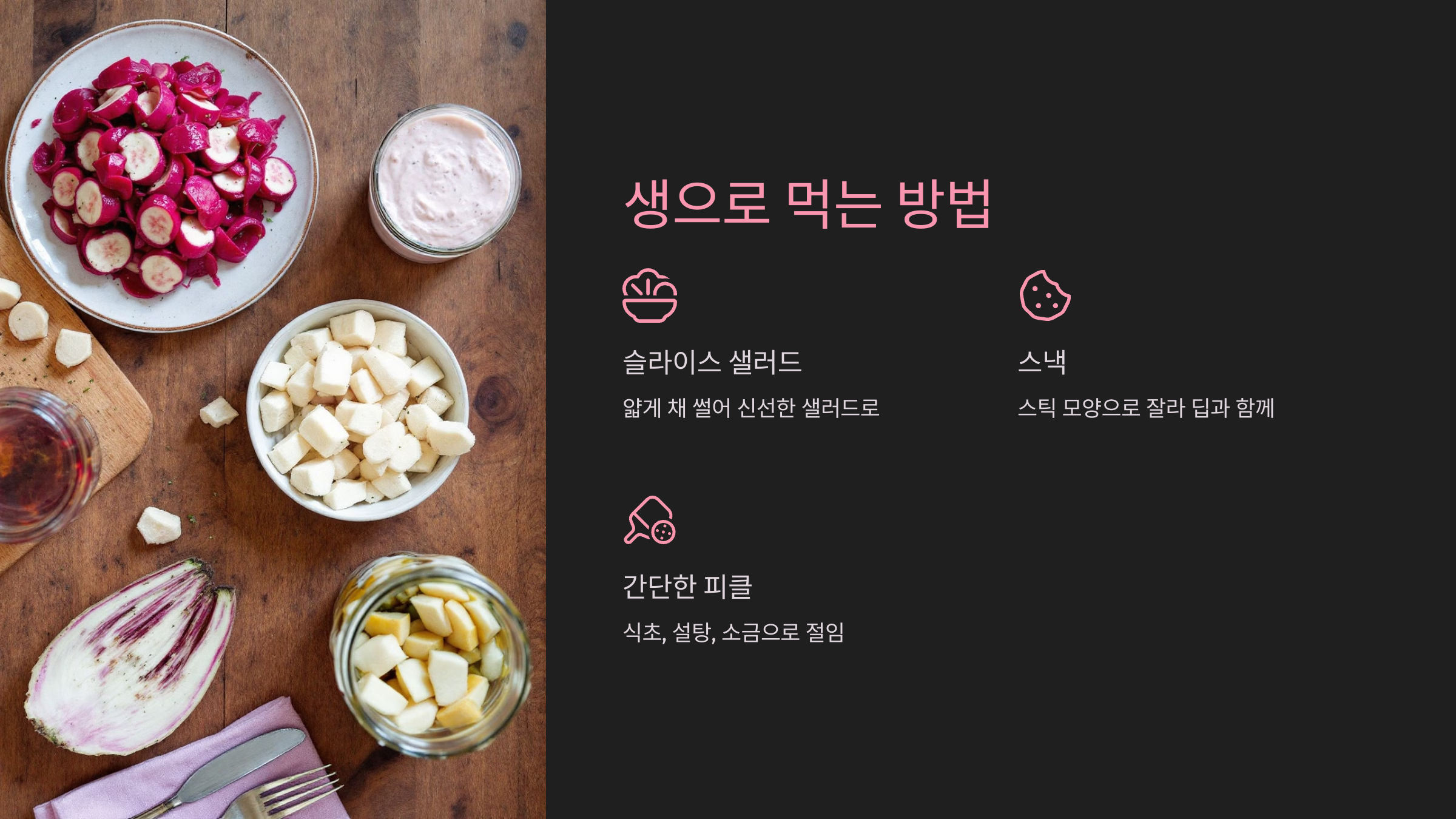 - 슬라이스 샐러드: 껍질을 얇게 벗겨 채 썰어 다른 채소와 섞으면 이상적인 샐러드 재료가 됩니다.