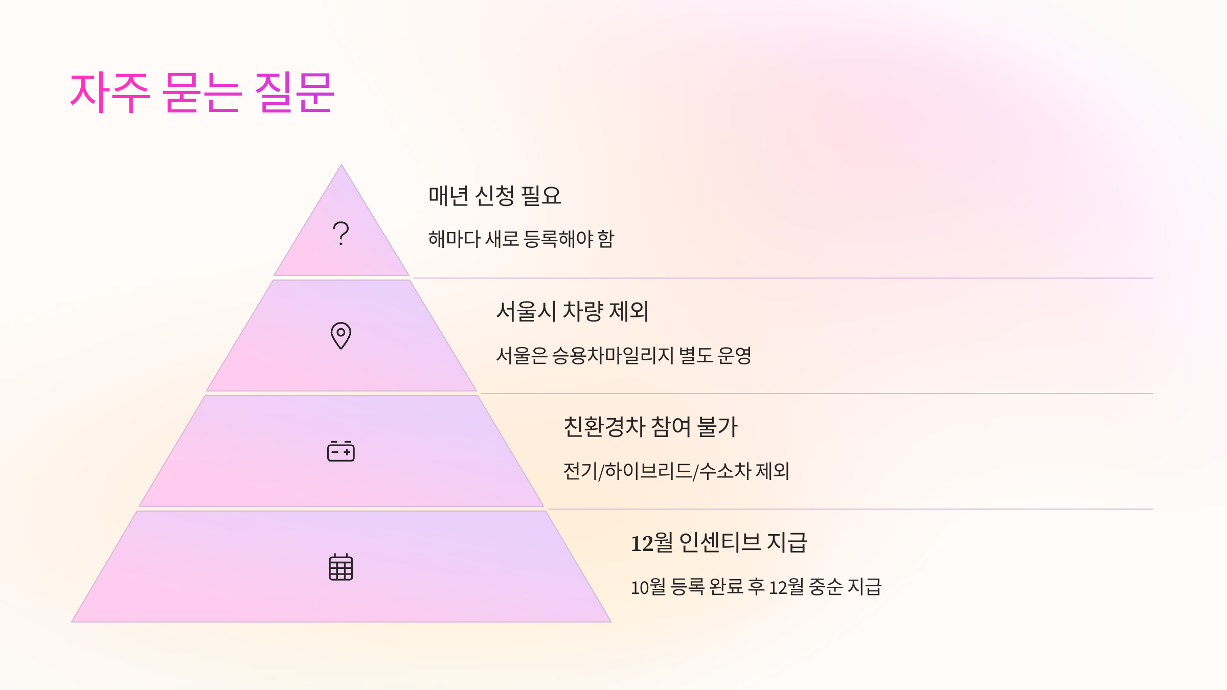 또한, 본 제도는 1인 1차량 등록을 원칙으로 해요. 만약 여러 대의 차량을 보유하고 있다면 한 대만 등록 가능하다는 점도 체크해야 해요. 기준은 소유주와 차량등록증 상 일치 여부로 판단되니, 본인 명의 차량이 아니면 참여가 어렵답니다.