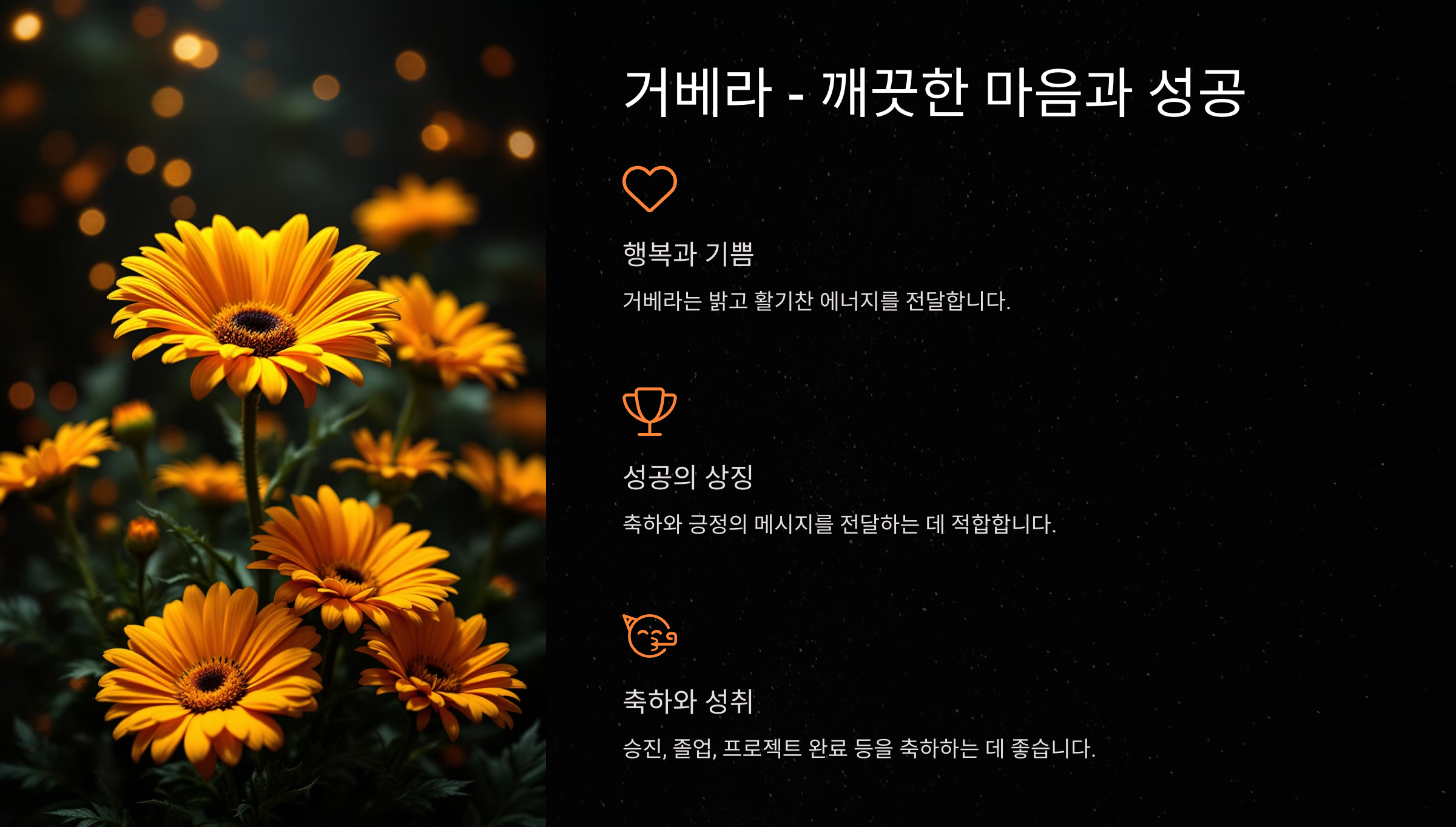 - 추천 이유: 거베라는 밝고 활기찬 에너지를 전달하는 데 탁월한 꽃이에요. 특히 축하와 긍정의 메시지를 전달하고 싶을 때 추천합니다.