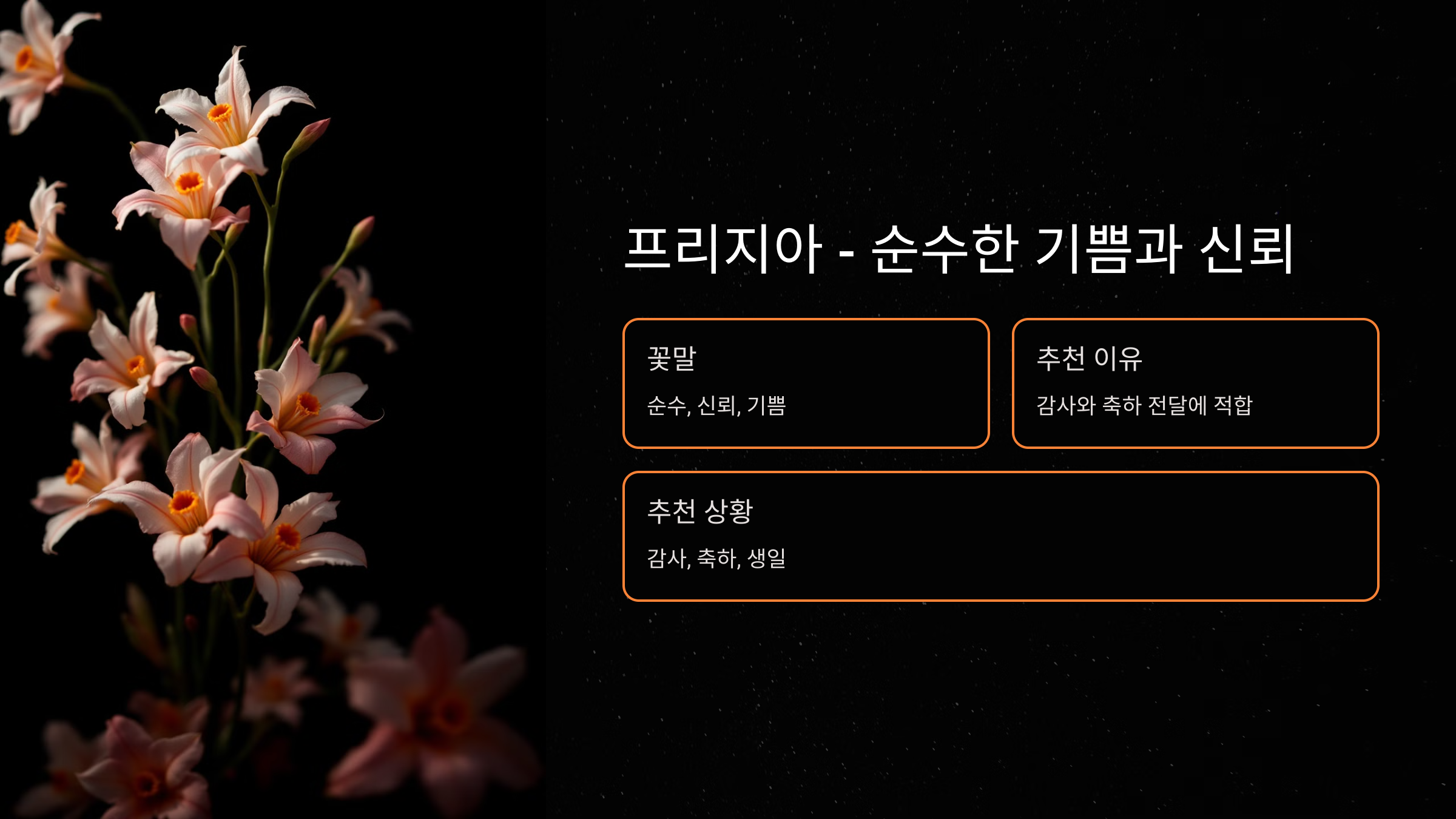 - 선물 팁: 프리지아 꽃다발과 함께 "당신께 순수한 감사의 마음을 전합니다"라는 카드를 준비해보세요. 🌼