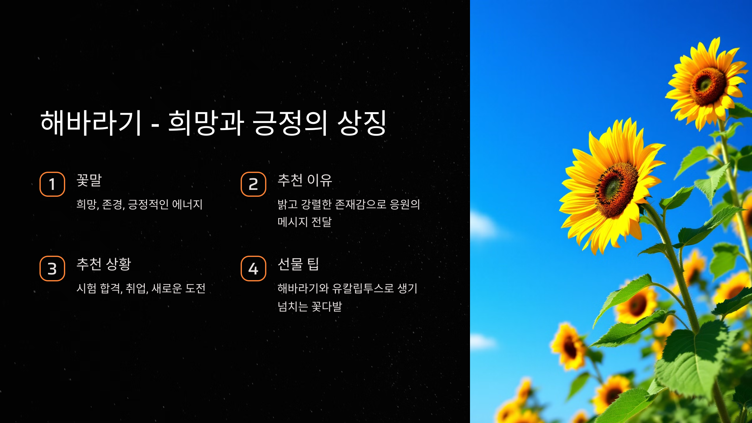 - 추천 이유: 해바라기는 밝고 강렬한 존재감으로 응원의 메시지를 담기에 딱 맞는 꽃이에요. 특히 새로운 도전이나 중요한 프로젝트를 마친 사람에게 용기를 전할 때 좋습니다.