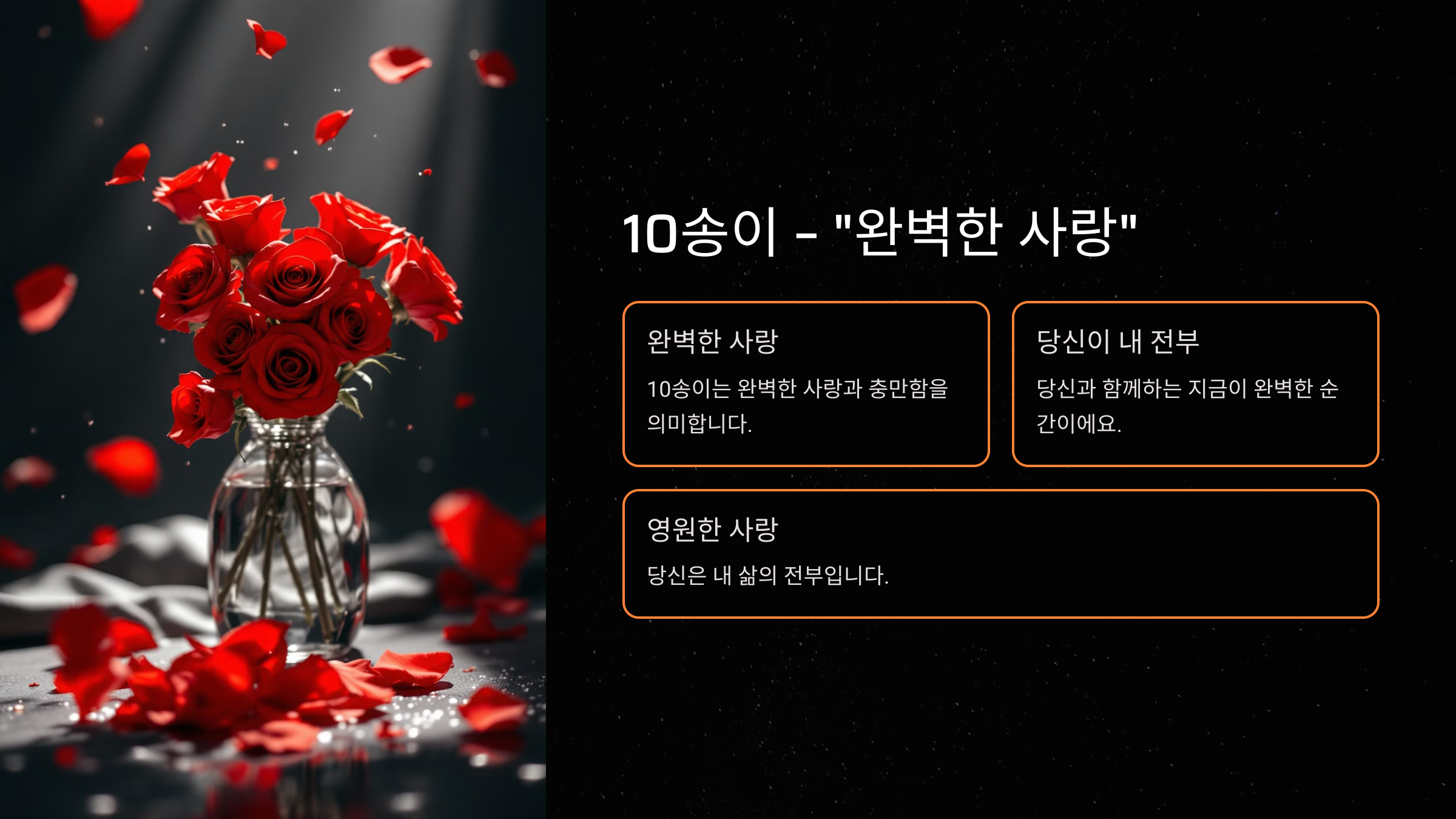10송이는 완벽한 사랑과 충만함을 의미합니다. 완벽한 사랑을 이루고 싶다는 메시지로 적합합니다.