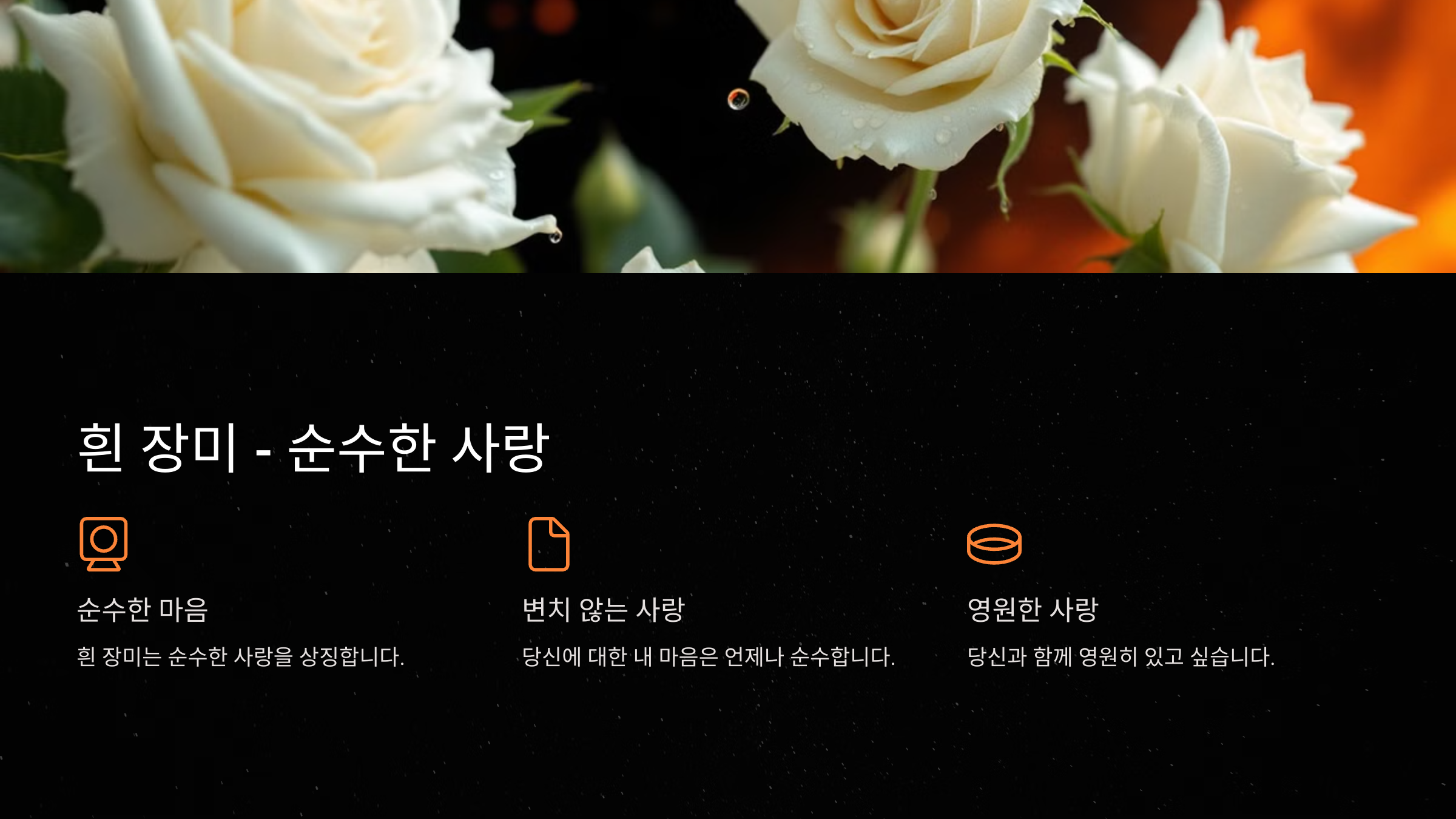흰 장미는 순수한 마음과 깨끗한 사랑을 상징합니다. 연인에게 헌신과 순수한 애정을 표현할 때 좋은 꽃입니다.