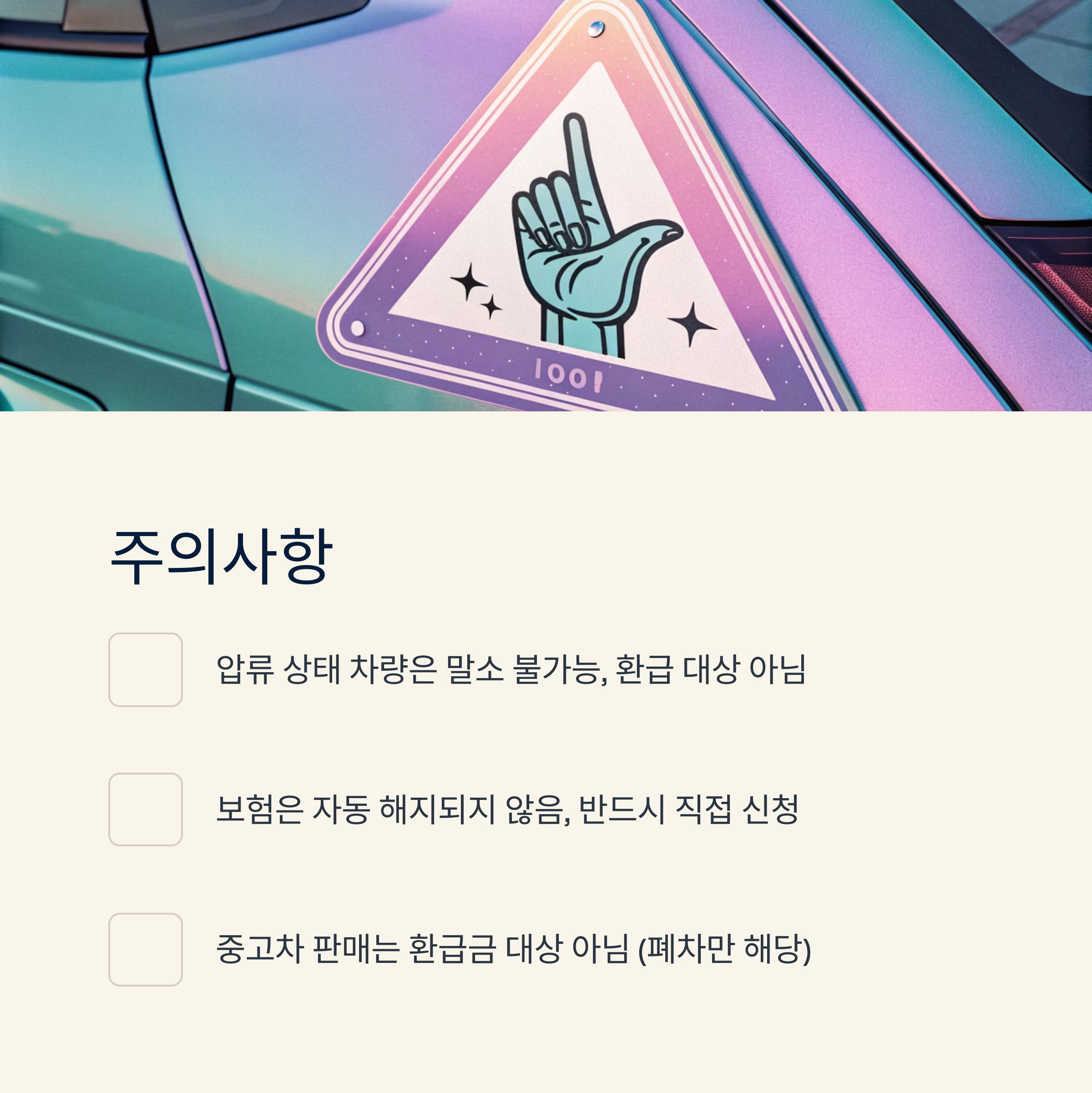 주의할 점은 차량이 압류 상태일 경우 말소가 불가능하다는 거예요. 압류 해제 후 폐차가 가능하므로 사전에 자동차등록원부를 조회해 보는 게 좋아요. 또한 중고차로 판매한 경우에는 환급금 대상이 되지 않으므로 반드시 ‘폐차’ 상태여야 해요.