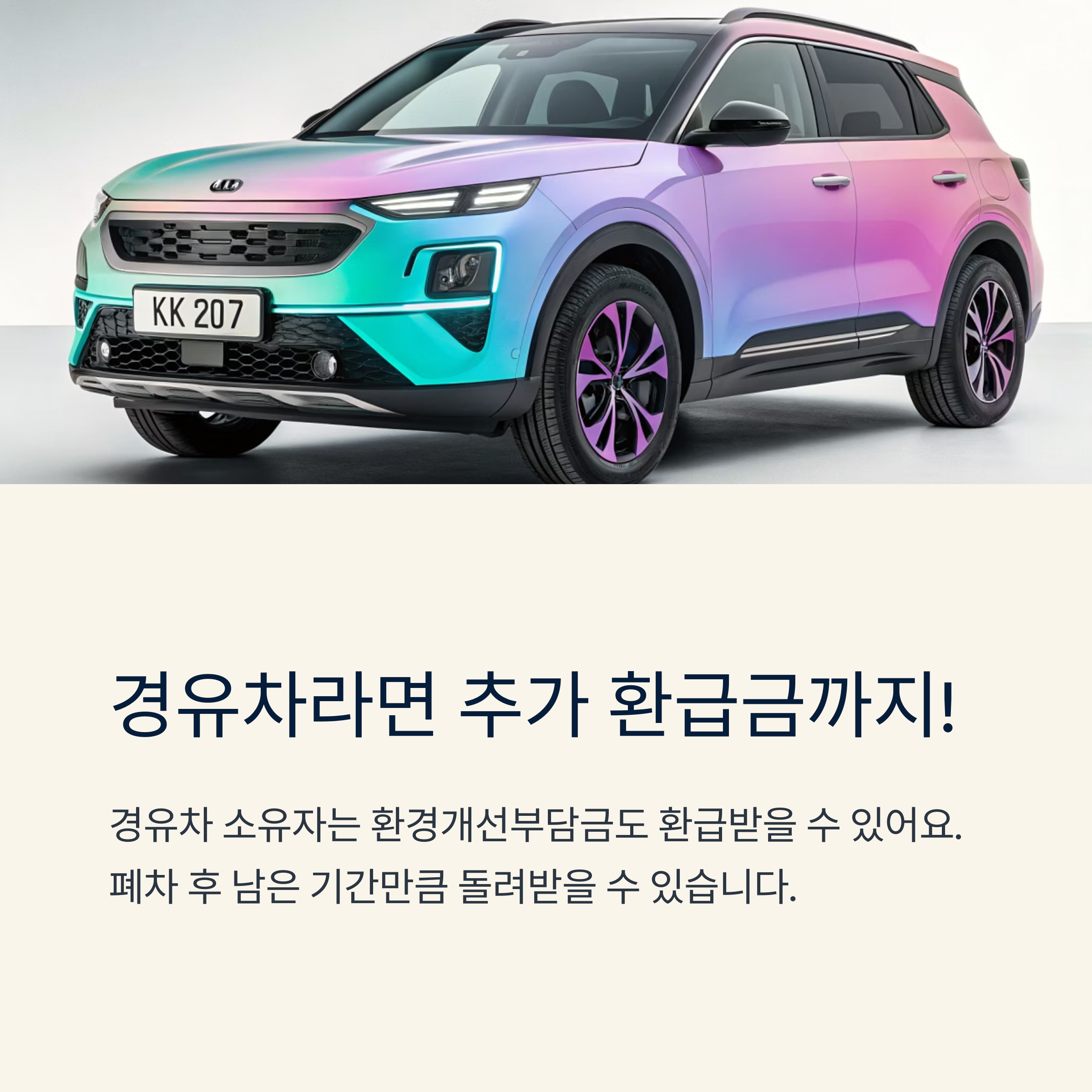 또한, 환경개선부담금이라는 것도 있어요. 경유차의 경우 대기오염을 줄이기 위한 세금 개념인데, 이 역시 분기별로 납부한 후 폐차 시 남은 기간에 대해 환급받을 수 있어요.