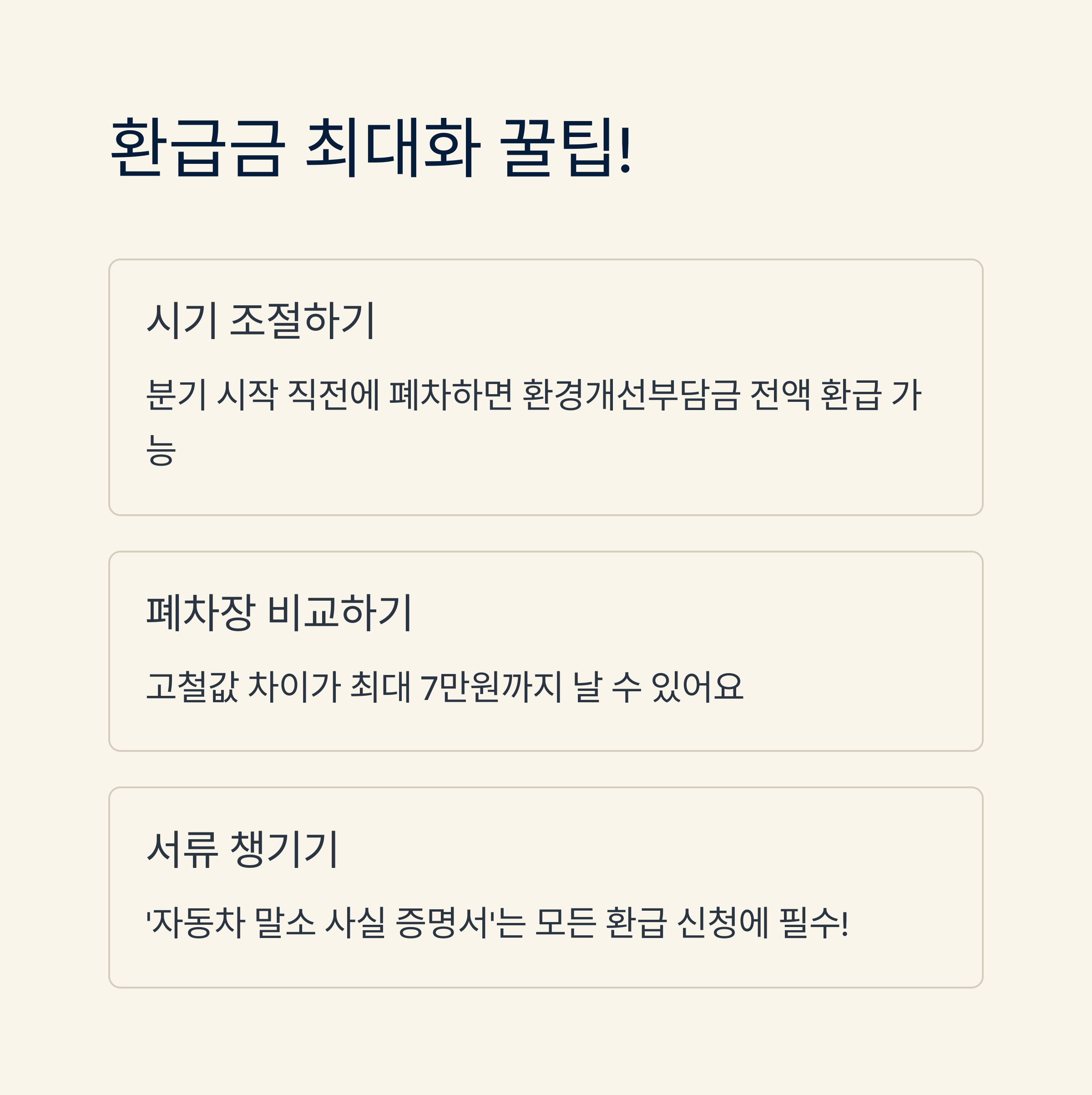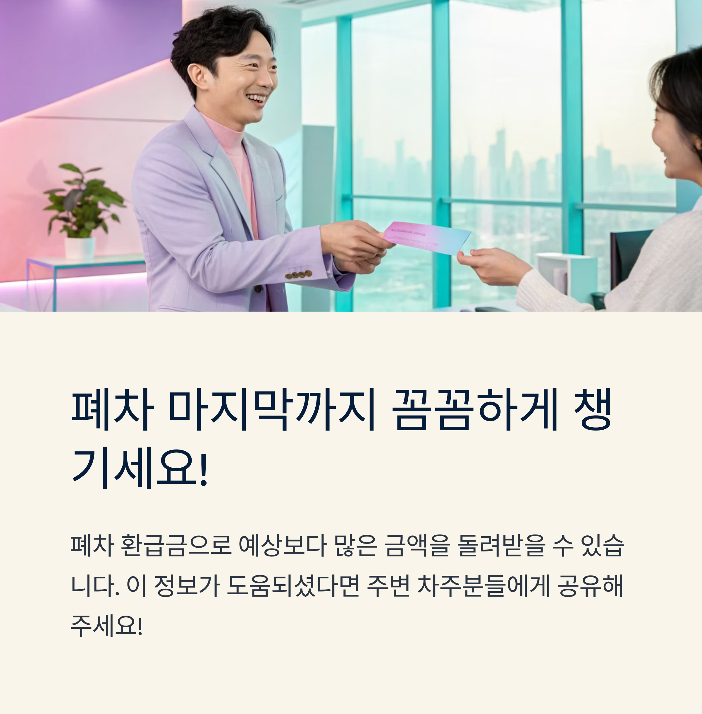 폐차 후 환급금은 무조건 ‘자동’으로 들어오는 게 아니기 때문에 내가 직접 챙기지 않으면 놓칠 수 있어요. 특히 환경개선부담금은 꼭 별도로 신청해야 한다는 걸 기억해야 해요!