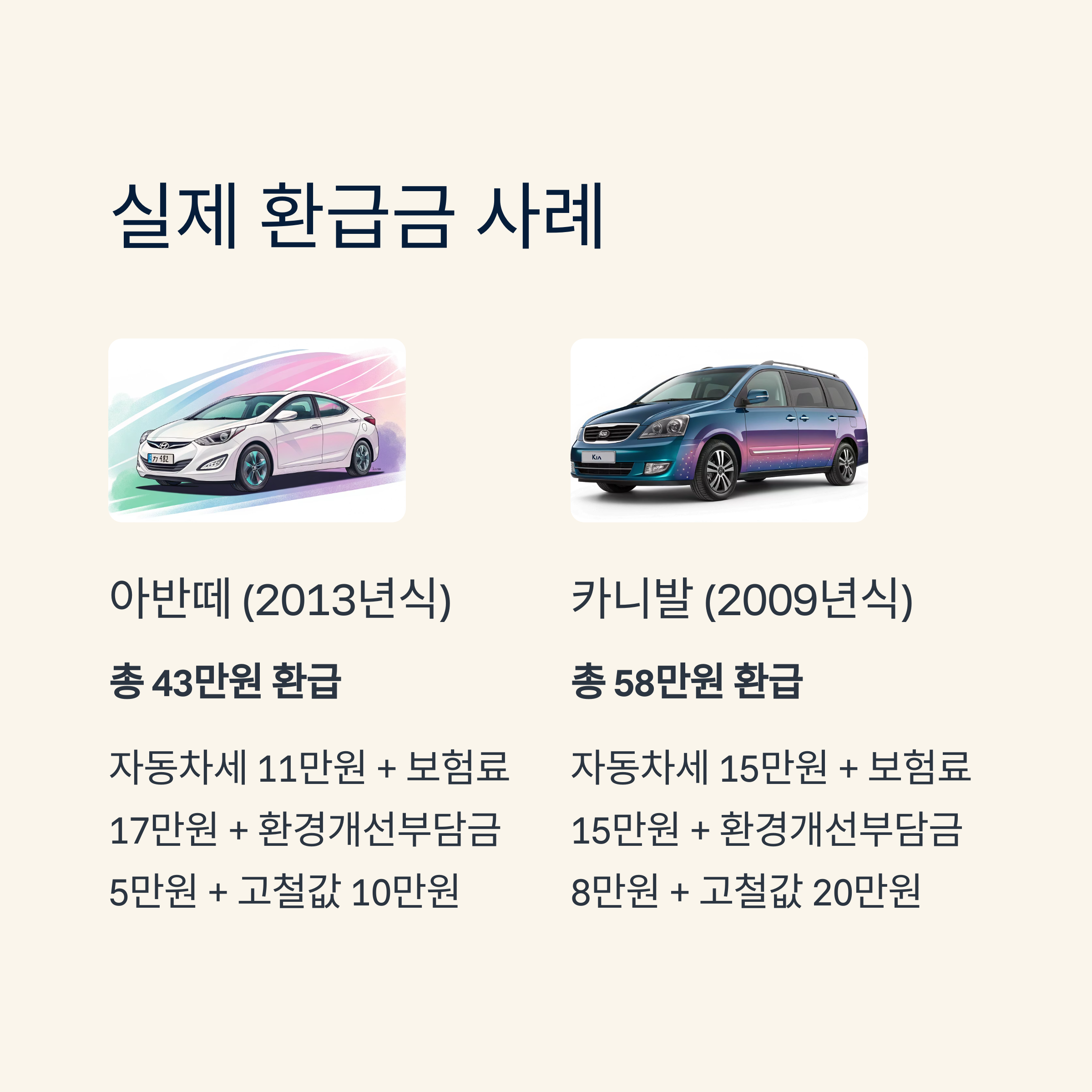 폐차 환급금을 실제로 받은 분들의 이야기를 보면 더욱 이해가 쉬워요. 서울에 사는 김OO 씨는 2013년식 아반떼를 폐차하면서 총 43만 원의 환급금을 받았다고 해요. 구체적으로 보면 자동차세 11만 원, 보험료 환급 17만 원, 환경개선부담금 5만 원, 폐차 고철값 10만 원이었어요.
