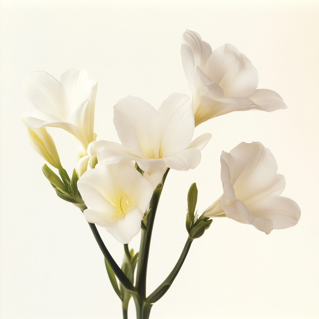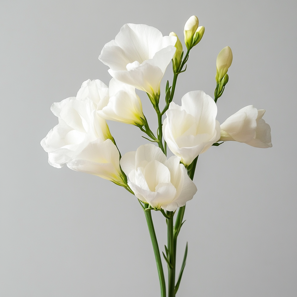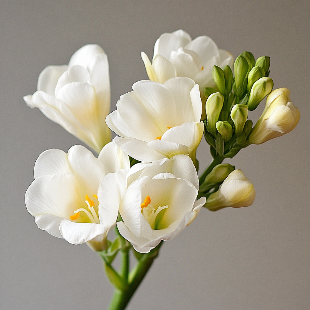 흰 프리지아는 "순수"와 "무결"을 상징하며, 그 청초한 이미지로 인해 결혼식이나 신부 부케로 자주 사용됩니다. 이 꽃은 진심 어린 마음을 전달하기에 적합하며, 존경과 감사를 표현하는 데 유용합니다.